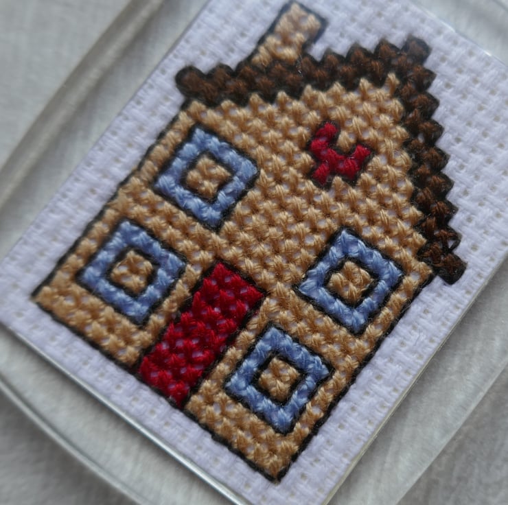 The house has been cross stitched on white aida - the fabric is approximately 4.5cm x 3.5cm. The house has been stitched in light brown thread with a dark brown roof. The window frames are blue, there is also a red door and small red heart. The house has been outlined in black thread.