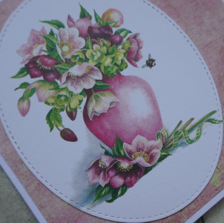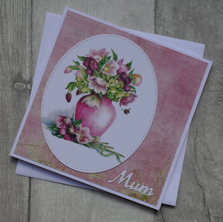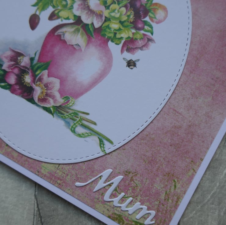A piece of pink paper with a feint green pattern had been attached to the front of the card leaving a white border around the edge. The precoloured Lili of the Valley vase of flowers image has been die cut into a stitched oval and attached to the card. 'Mum' has been die cut from white card and attached along the lower edge.of the card.