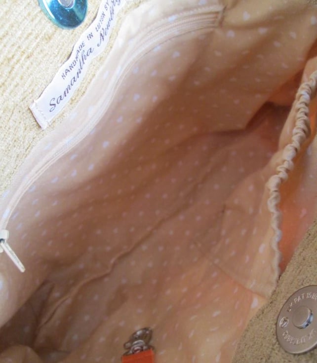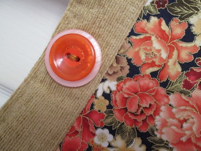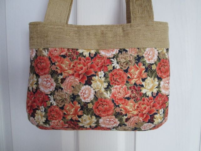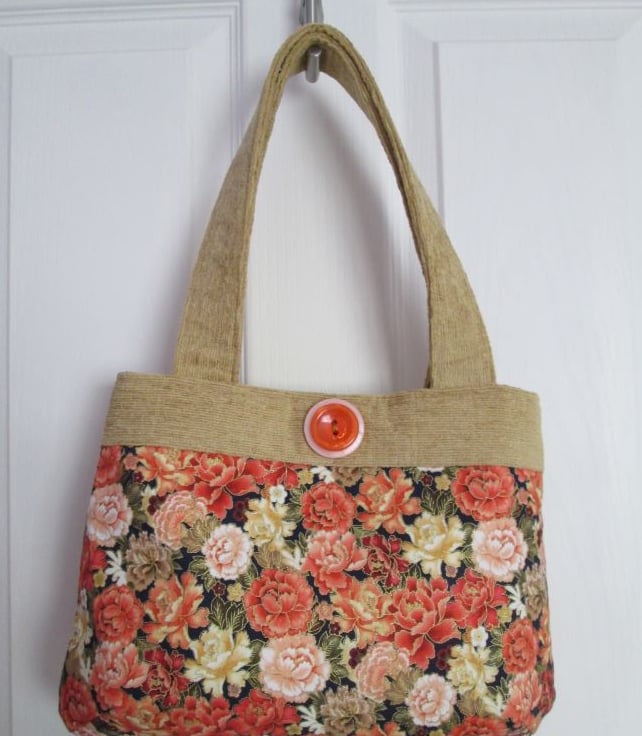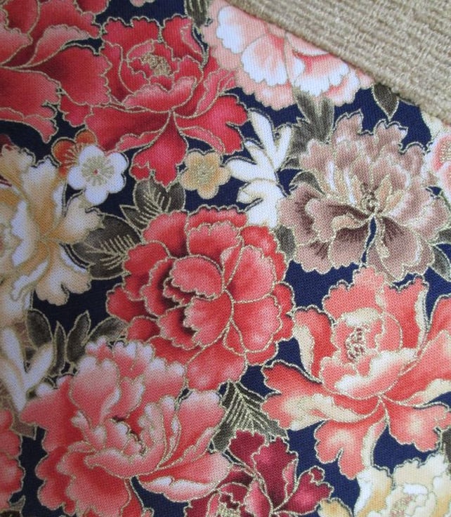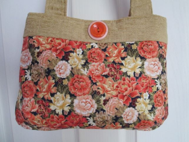 I'm not normally a fan of orange, but this Oriental style print is simply gorgeous with its rich autumnal pattern of paeonies in shades of cream, peach, orange and taupe, highlighted with metallic gold. To set this lovely fabric off, I've used a piece of gold coloured chenille for the contrast bands and handles, with a lining of dark cream cotton patterned with tiny spots and hearts, and finished it all off with a pair of coordinating layered buttons.
