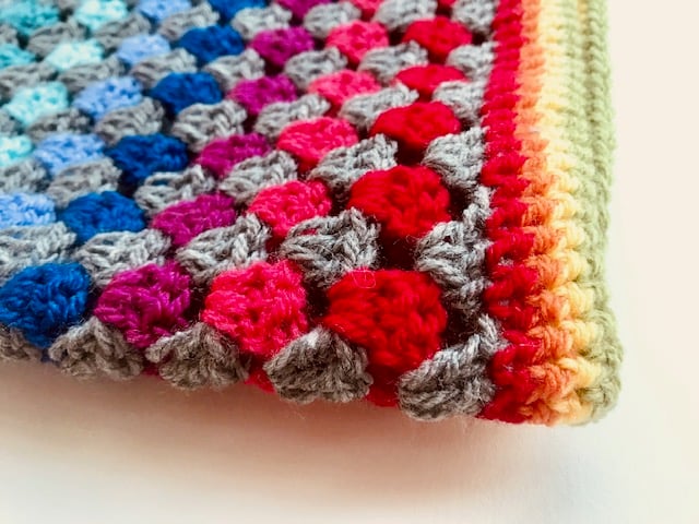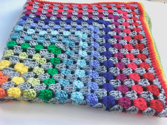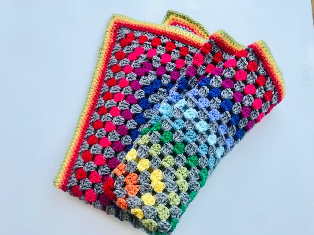 Crocheted in rainbow colours and grey.
