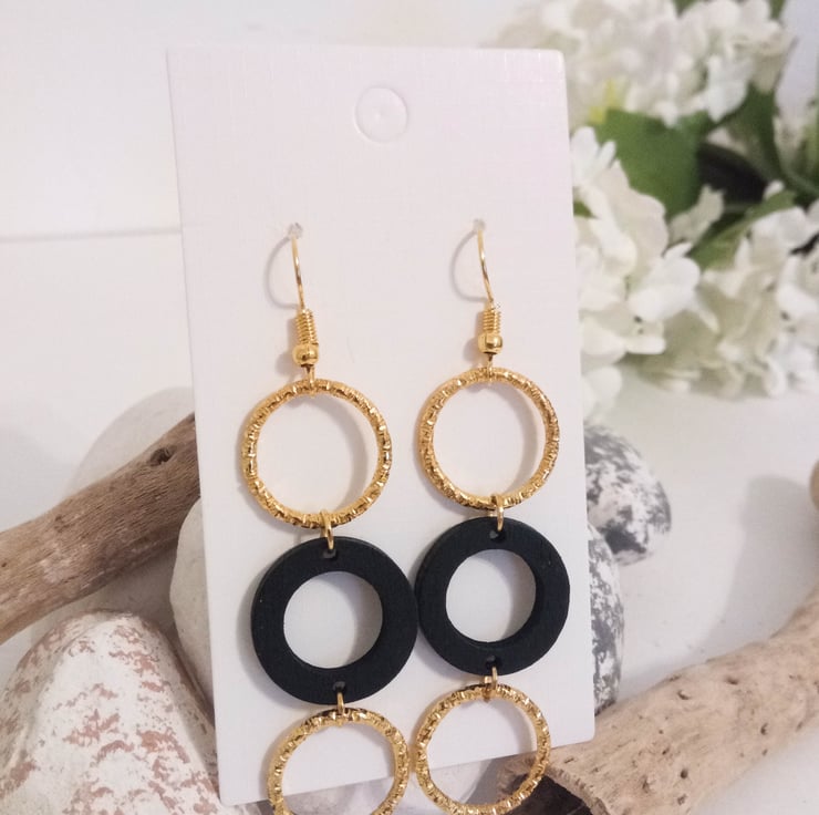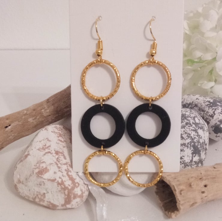 These black and gold earrings feature three hoops; a black wooden hoop dangles in the middle of two gold hoops. The hoops hang from gold plated fish hooks.