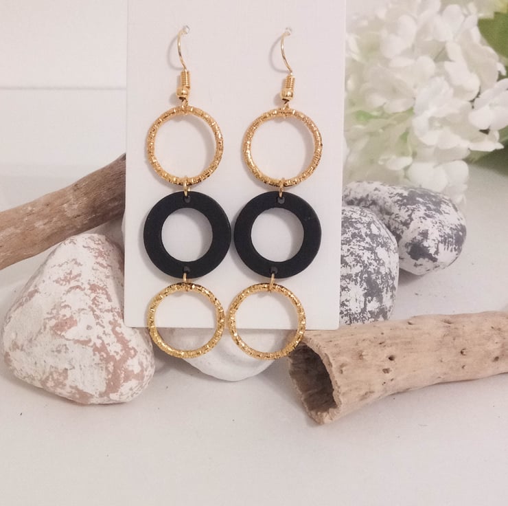 Handcrafted black and gold three hoop earrings.