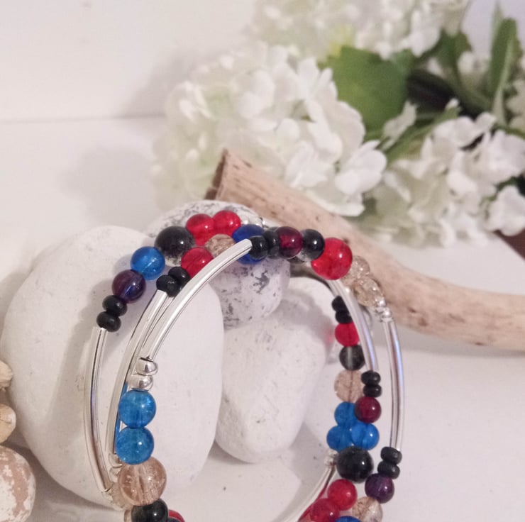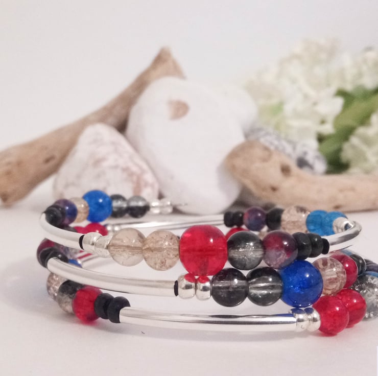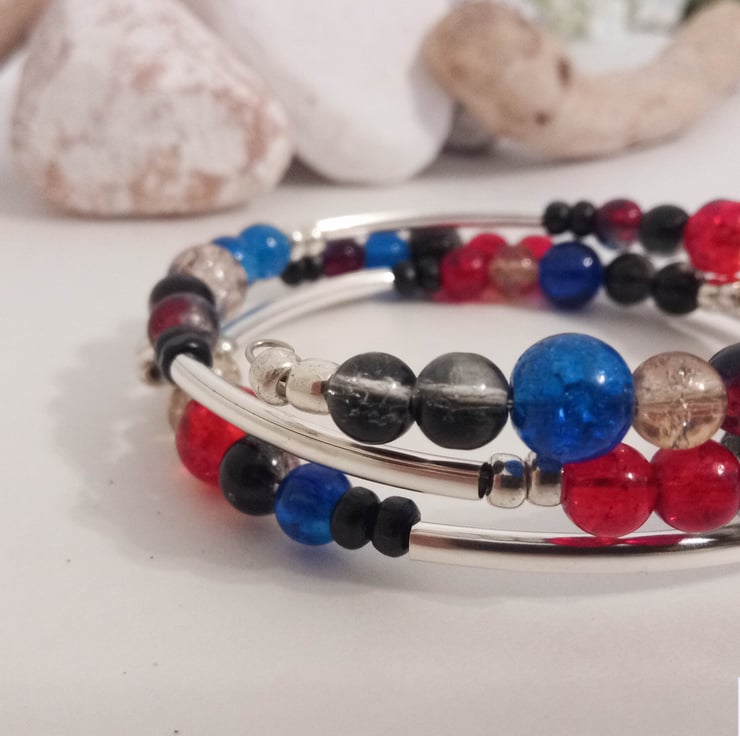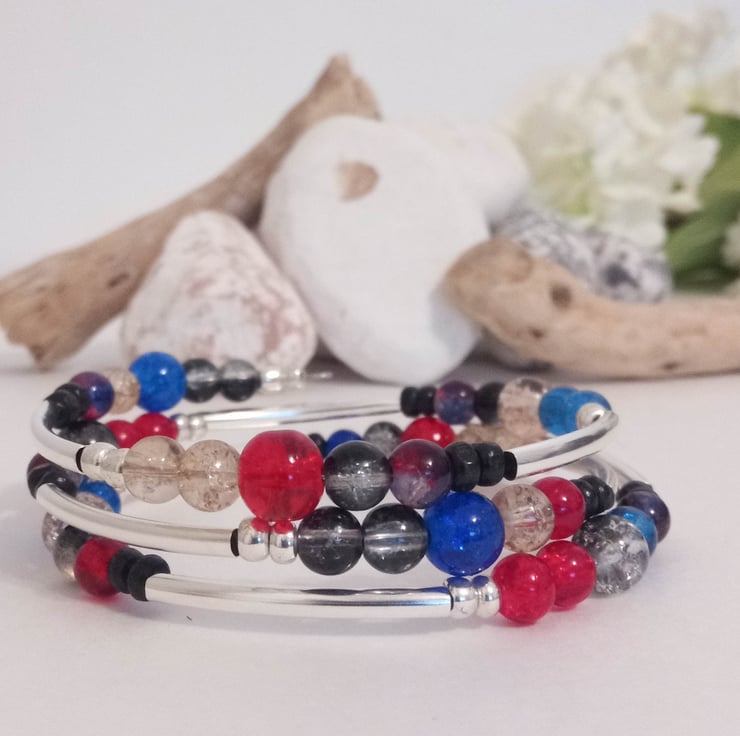 The bracelet is decorated with blue, red, black and clear glass crackle beads, with silver coloured tube spacers.