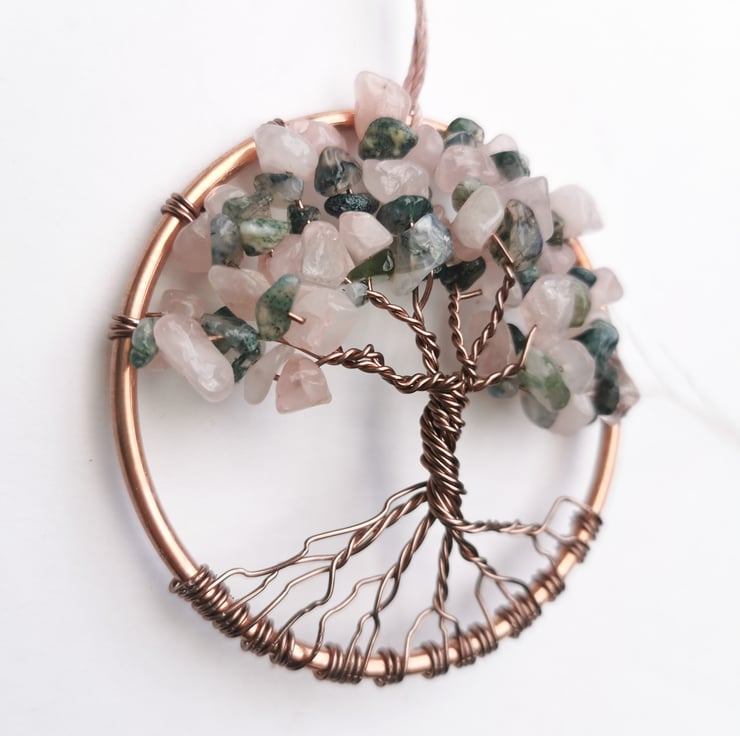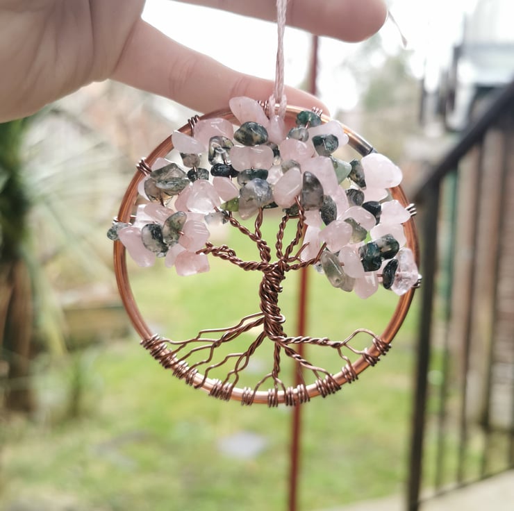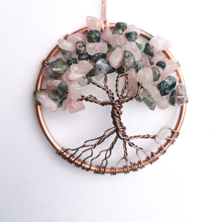 The wire tree sculpture has rose quartz and moss agate crystals to represent blossom on the tree of life. It is situated on a 3 inch copper hoop. The gemstone tree would make the most perfect addition to your car or any window.