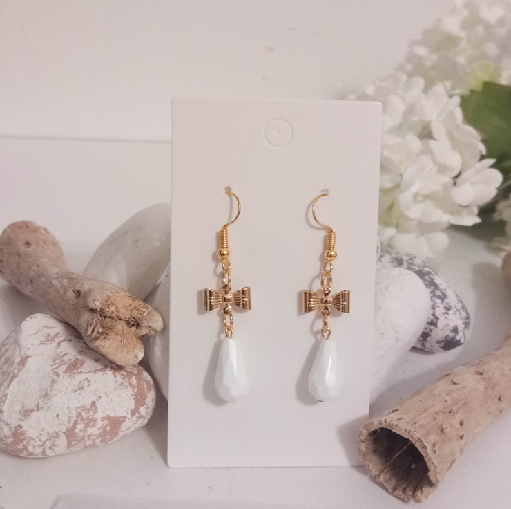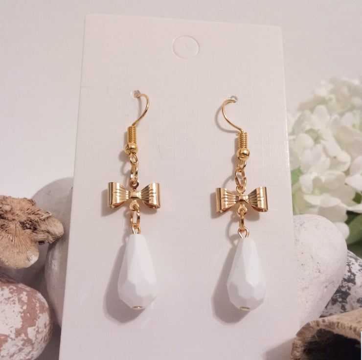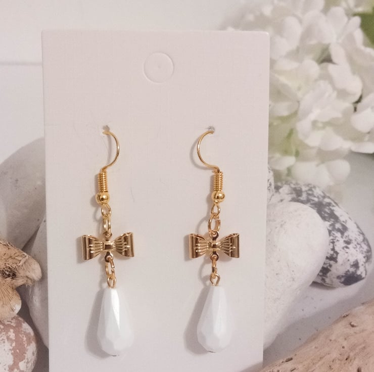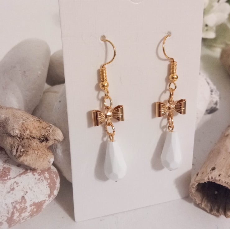 This handcrafted pair of gold plated earrings feature cute gold bow connectors and white faceted bead drop charms.