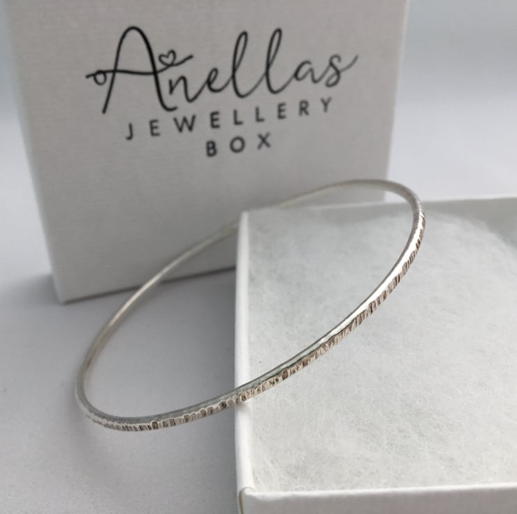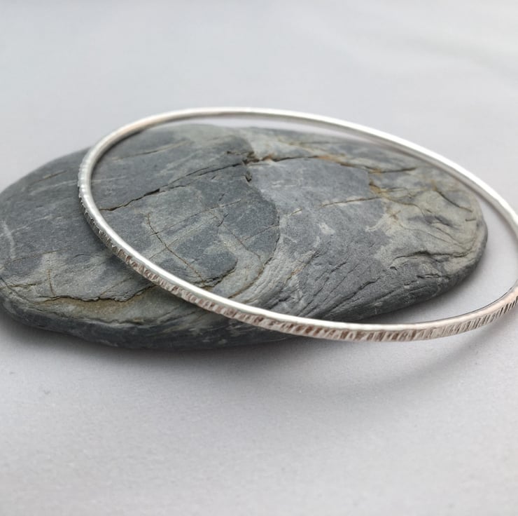 The minimalist bangle is made from 2 mm thick sterling silver wire and is available with either a smooth or textured finish. It looks great on its own or when stacked with other bangles.