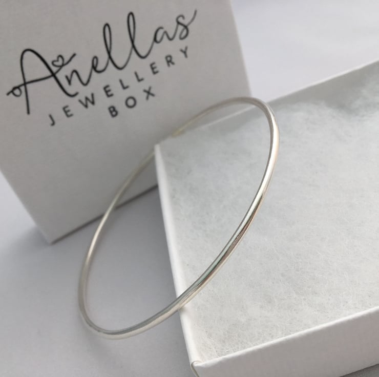 This sterling silver plain bangle measures approximately 6.5 cm in diameter (21 cm circumference) as standard but is also available in a larger (23 cm) or smaller (19 cm) size.