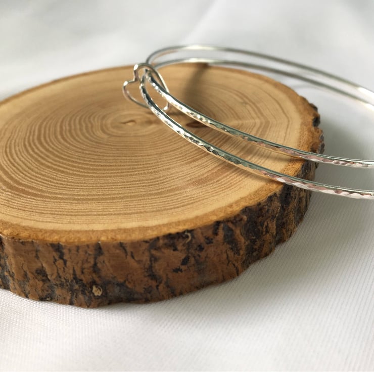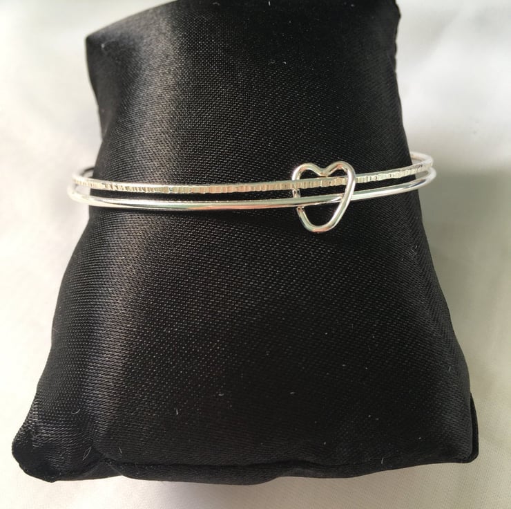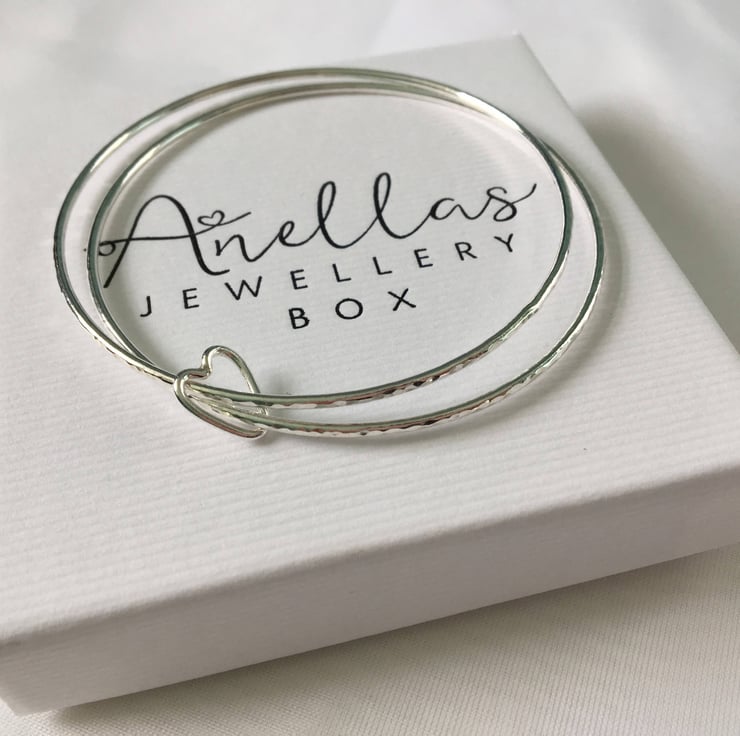 From the photographs you will see that one of the bangles has a smooth finish and the other bangle has a textured finish, which beautifully shows the contrast in textures. If preferred, there is the option to select either a smooth finish for both or textured finish for both bangles.The heart charm will have a smooth finish unless requested otherwise.