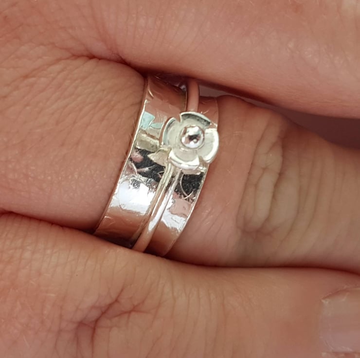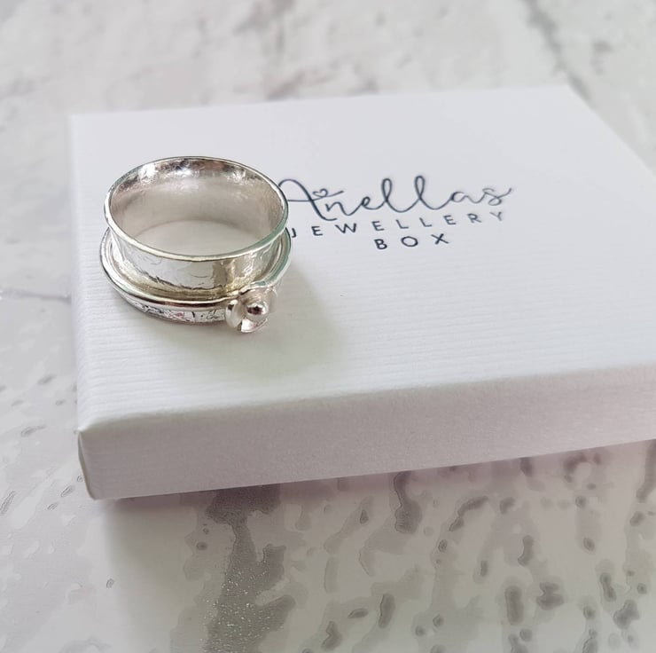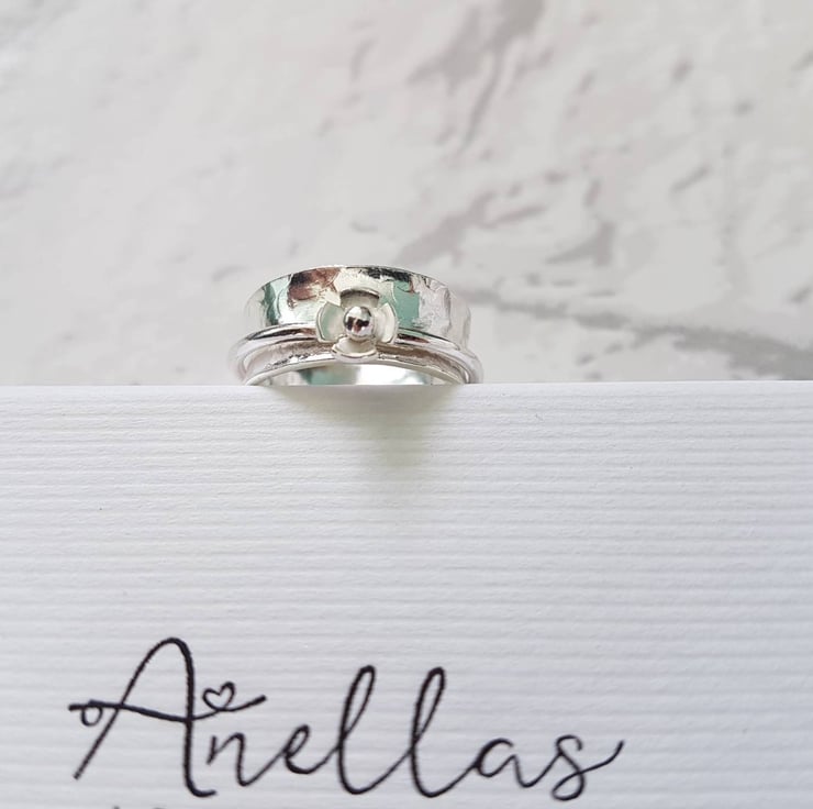 This sterling silver spinner ring (also known as a meditation, worry or anxiety ring) has been given a gorgeous textured finish, which has a very floral feel to it. This finish, perfectly matches the thin flower spin ring, which adds a little something special to this spinner. The ring with the flower has been purposefully left smooth to beautifully highlight the contrast in textures.