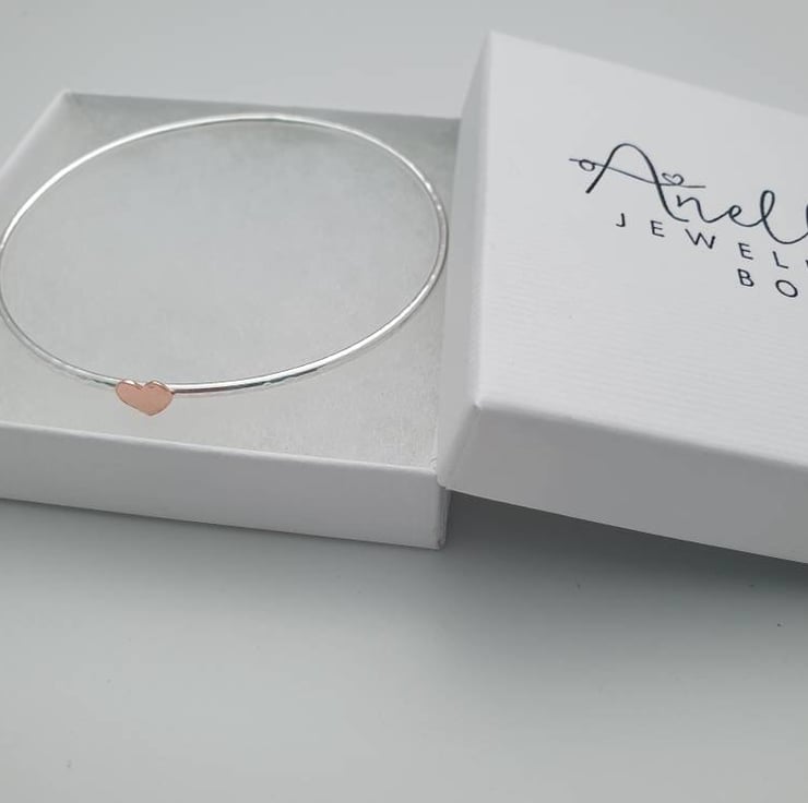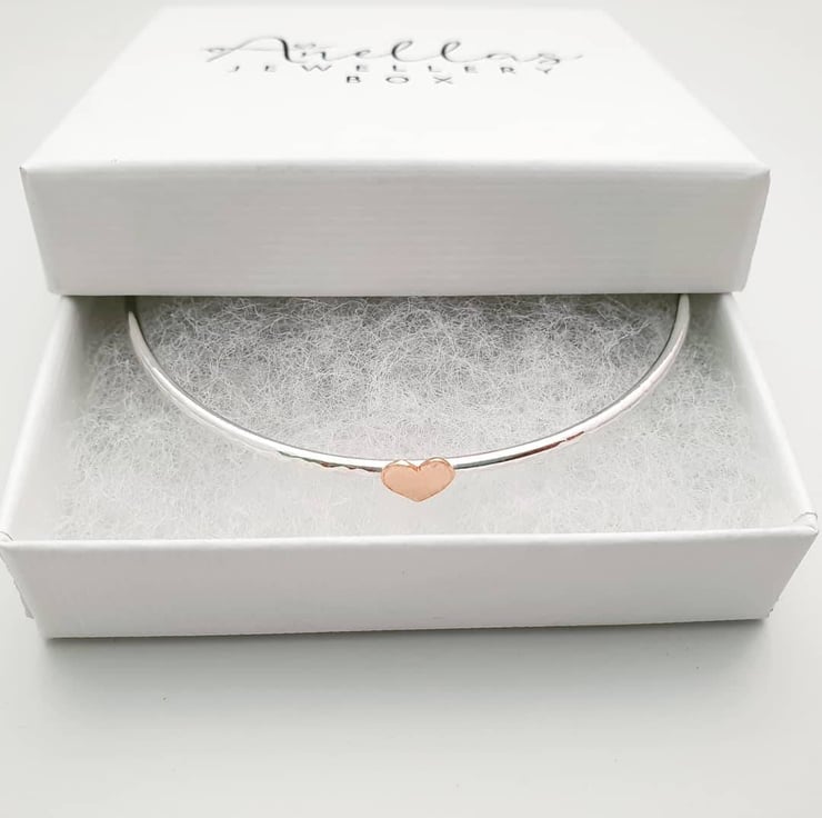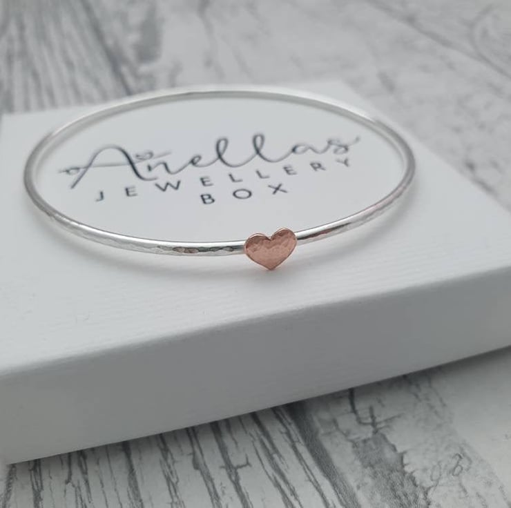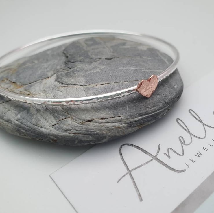 Sterling silver bangle with a copper heart charm attached. Both the bangle and heart have a textured finish.