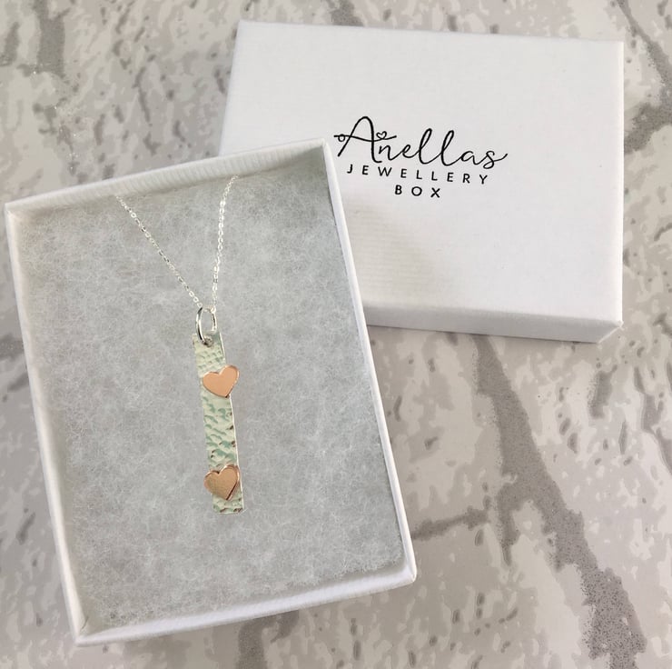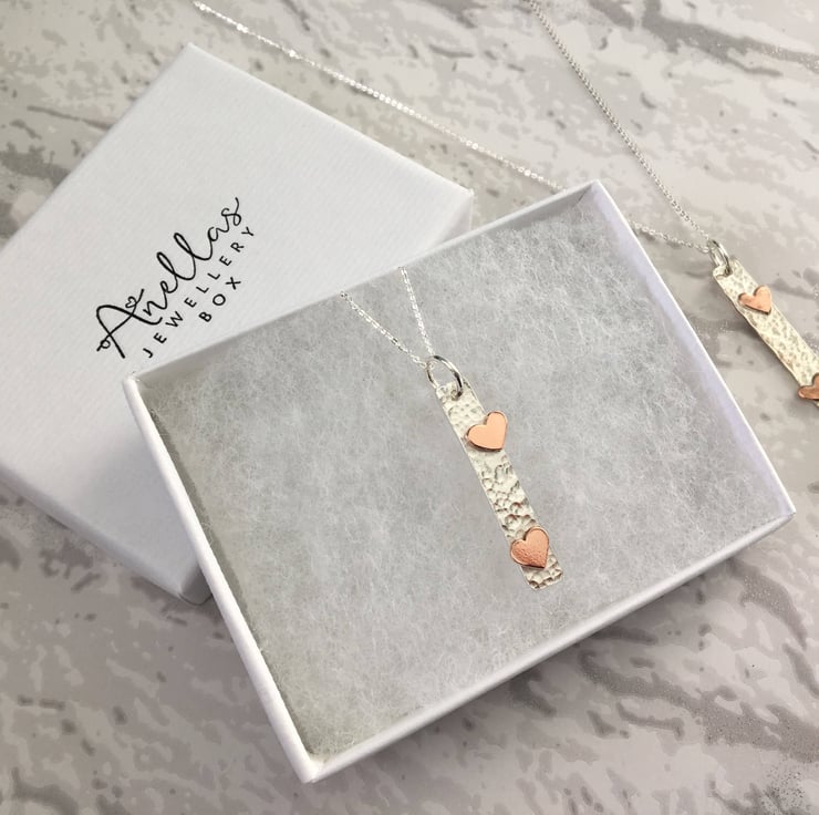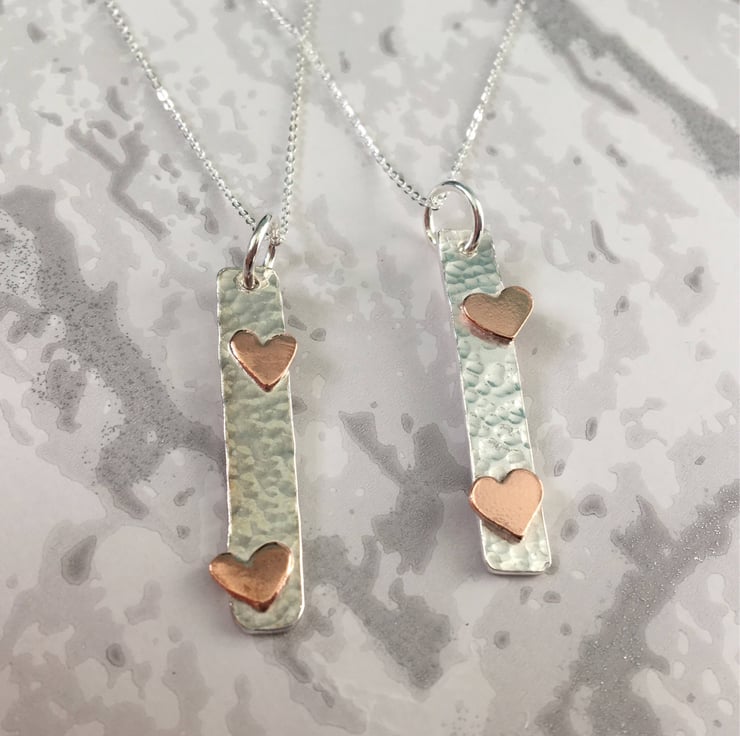 This sterling silver bar necklace features two small copper hearts. One of the hearts is located more towards the top right hand side of the pendant and the other is more towards the bottom left hand side. Whilst the silver bar has been given a gorgeous dimpled finish, the two hearts have been left smooth. This beautifully shows the contrast in textures between the two.