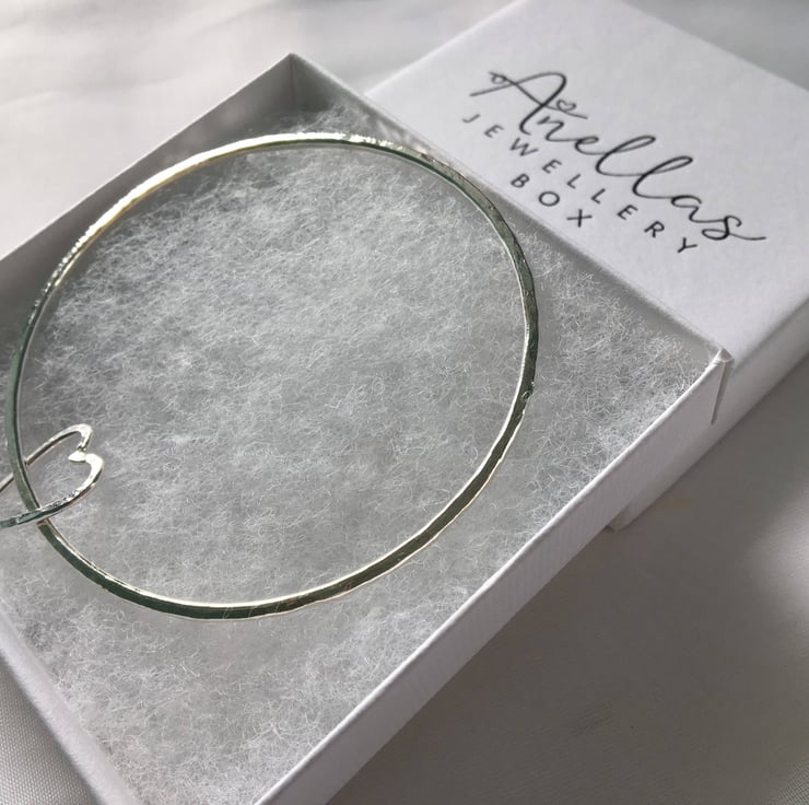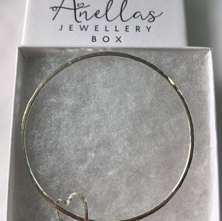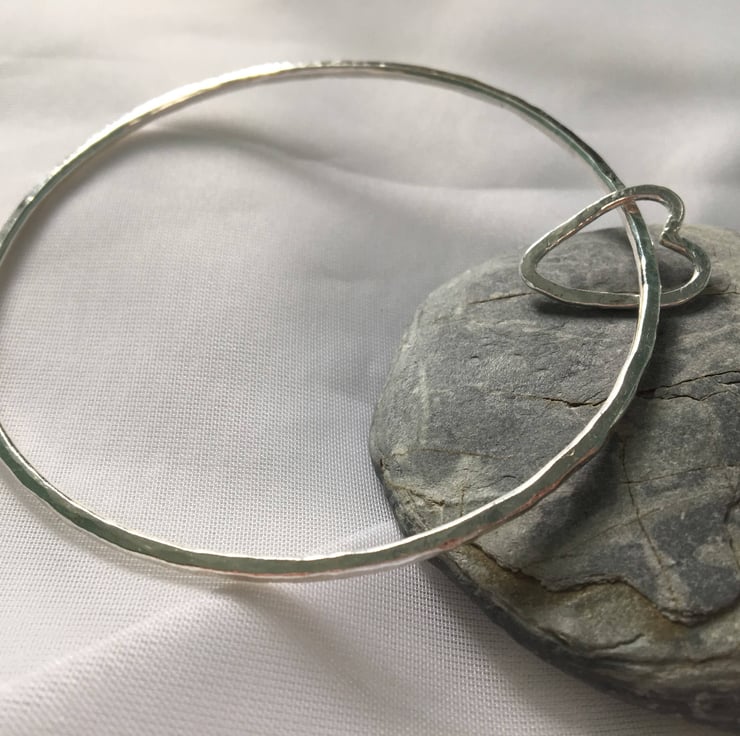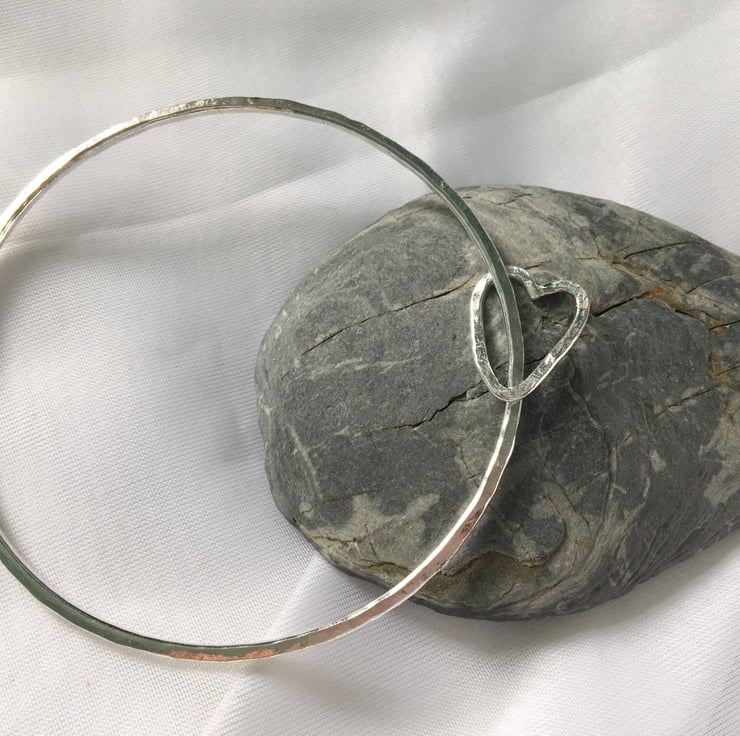 A sterling silver bangle which has been hammered lightly to give a finish which looks and feels like it's been handcrafted. To complete the bangle there's a single hollow heart, made from sterling silver wire, which goes through the middle of the bracelet. If you like your jewellery to have a handmade feel, this could be the bangle for you.