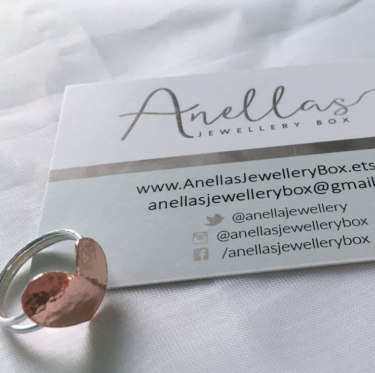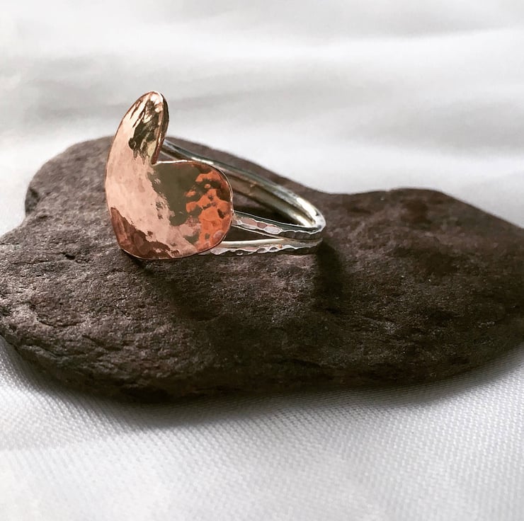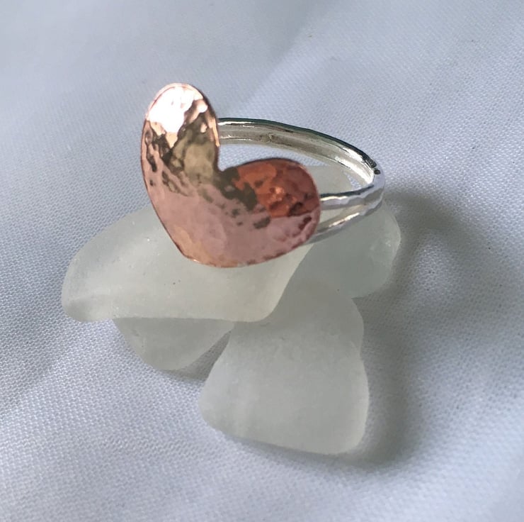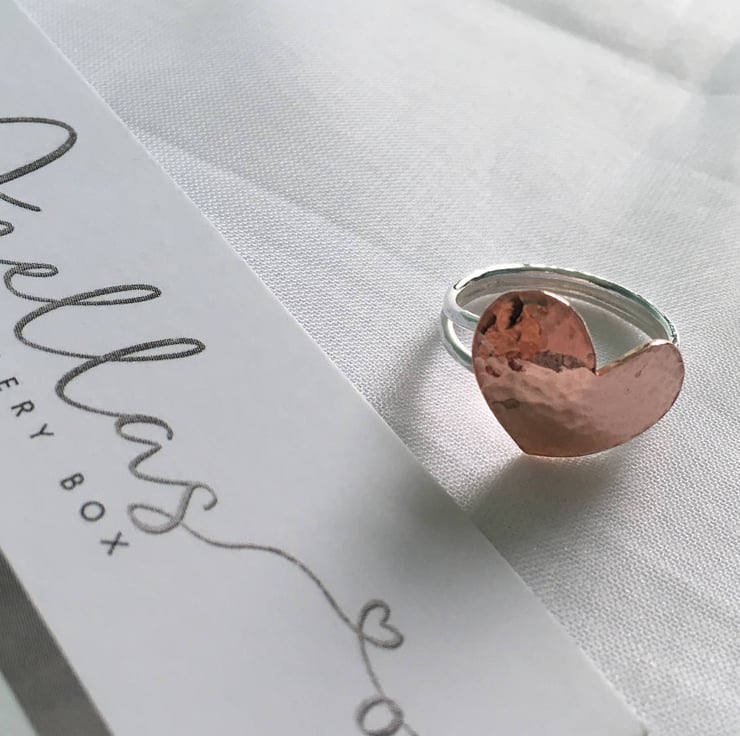 The heart ring is made from 1.2 mm thick sterling silver wire, which actually means it has a thickness of approximately 2.4 mm once finished. Both the ring and the copper heart have been hammered lightly to give a textured finish.