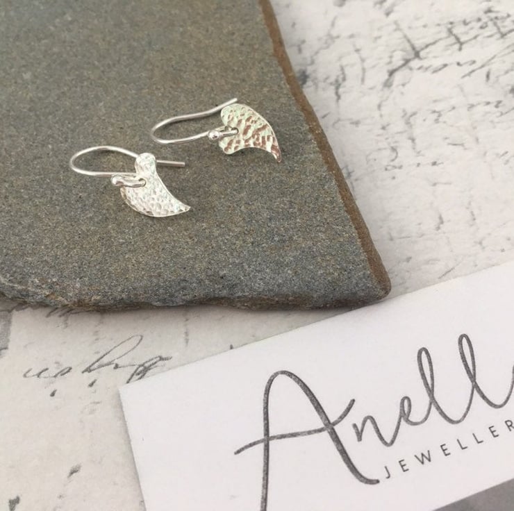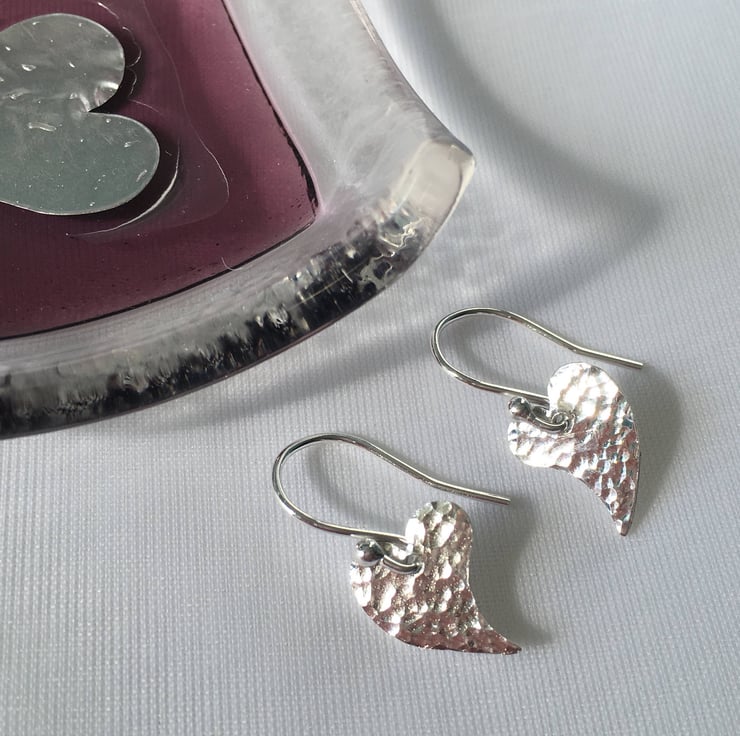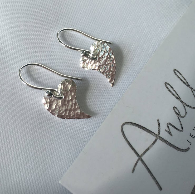 These handmade sterling silver heart dangle earrings have a unique style due to their curved shape and hammered finish. They are a must have for any heart jewellery lovers out there and will certainly see you stand out from the crowd when wearing them. A great pair of versatile yet simple earrings, which can be worn as everyday earrings or kept for special occasions.