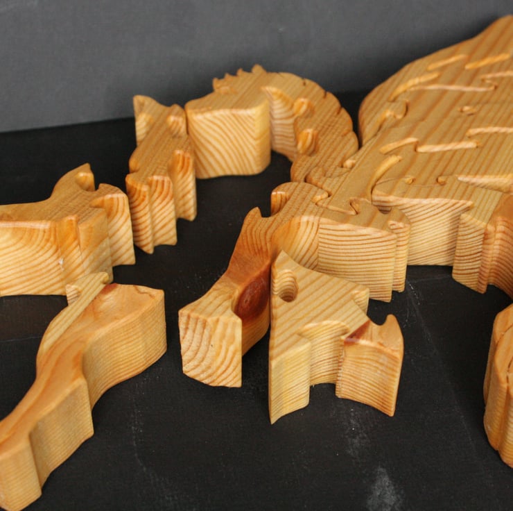 A piece of recycled wood was cleaned and sanded to enable me to upcycle it. The design was applied to the wood and cut using a Scroll Saw. The puzzle was then assembled and disassembled to ensure that all the pieces fitted together smoothly. Each piece was lightly sanded all around to give them a slight round over effect. It was then coated in Danish Oil and buffed to a smooth finish.
