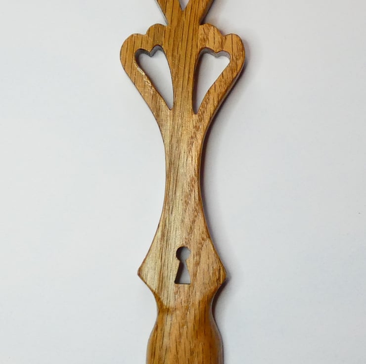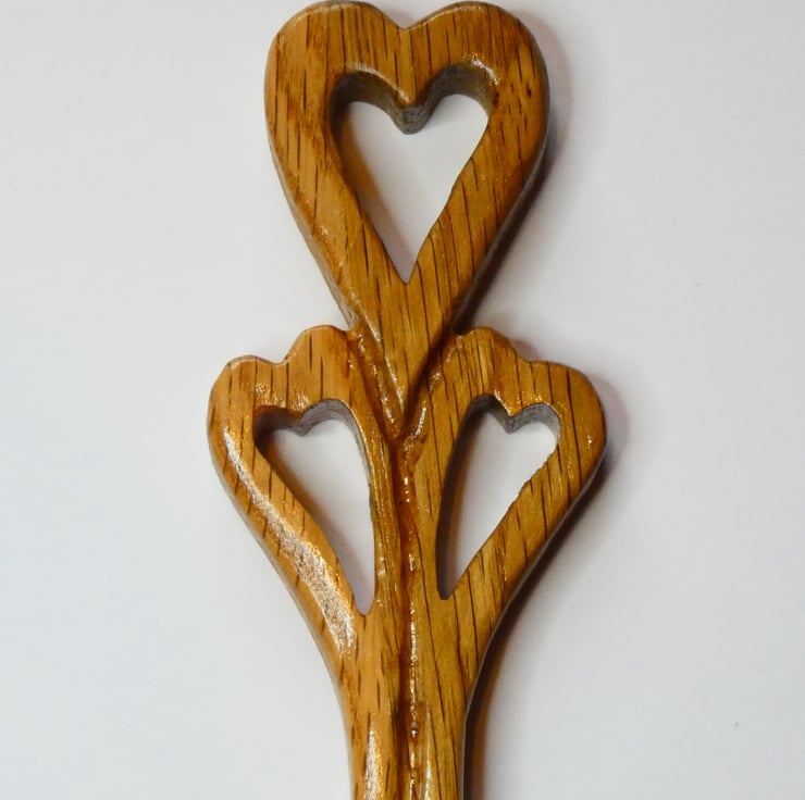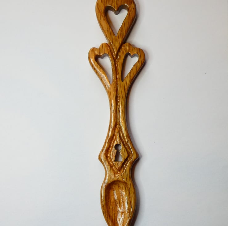 Delightful traditional Welsh love spoon with three hearts and a keyhole, handcrafted from solid Oak. It has been upcycled from reclaimed wood. This handcrafted spoon will make a perfect present for Valentine, an anniversary, birthday, wedding, engagement, or just for a person you love.