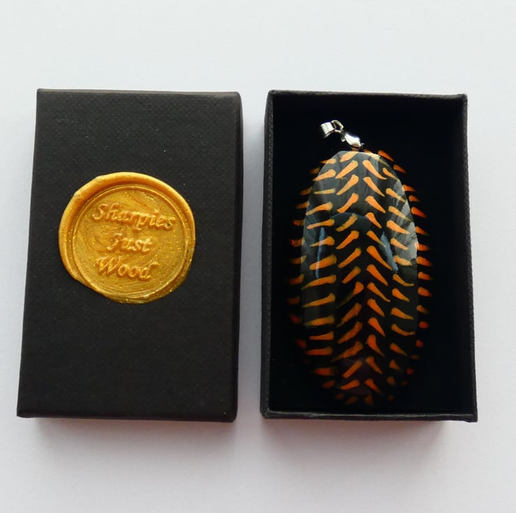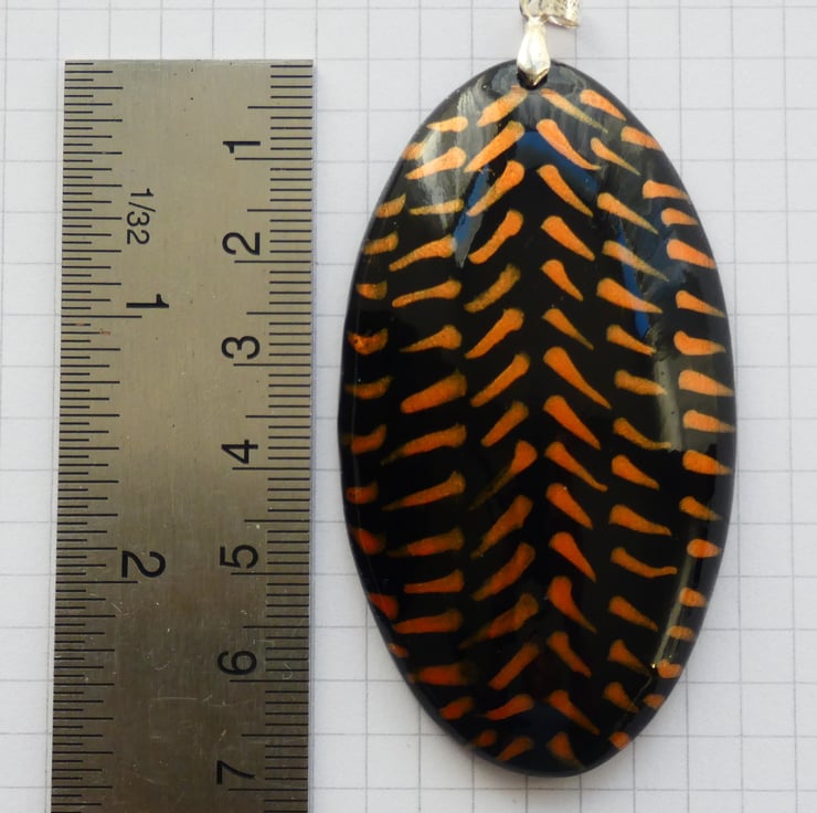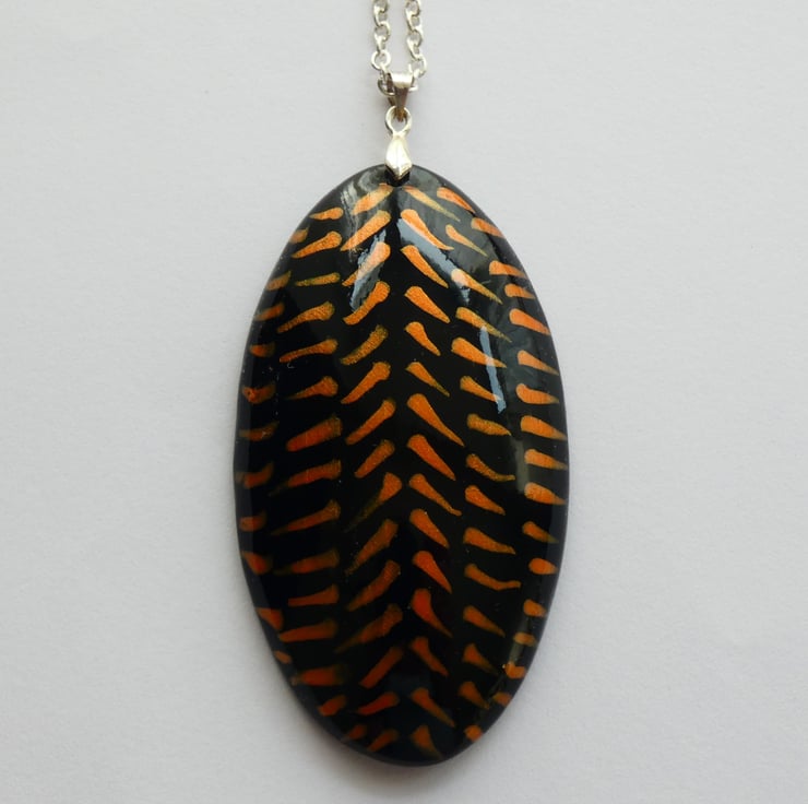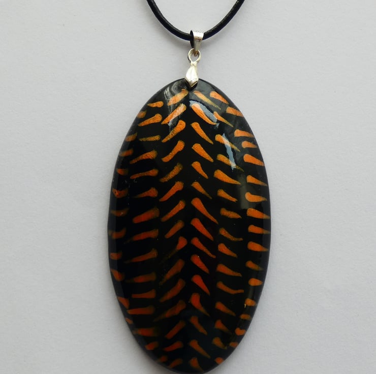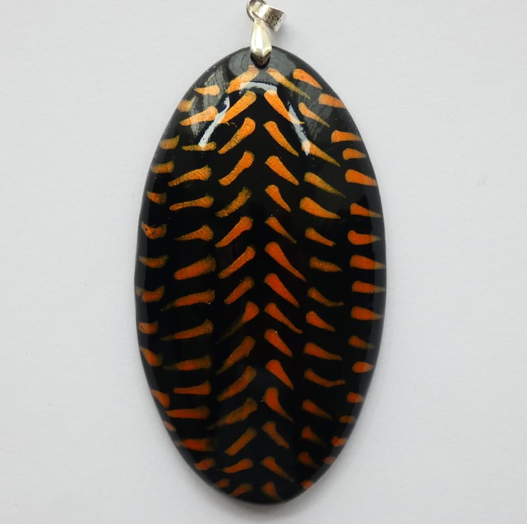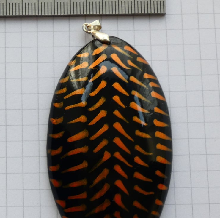 This pendant was cut and shaped from a piece of wood before being sanded to a smooth finish. It was painted with black paint before the orange iridescent paint was applied. Each orange line was created by putting on a dot of paint which was then formed into the lines with a paint brush creating the pattern that you see. It is impossible to recreate the exact pattern due to the unique way in which the patterns are formed. It is smooth to the touch and has been finished with several coats of Lacquer to enhance the colours whilst also protecting the pendant.