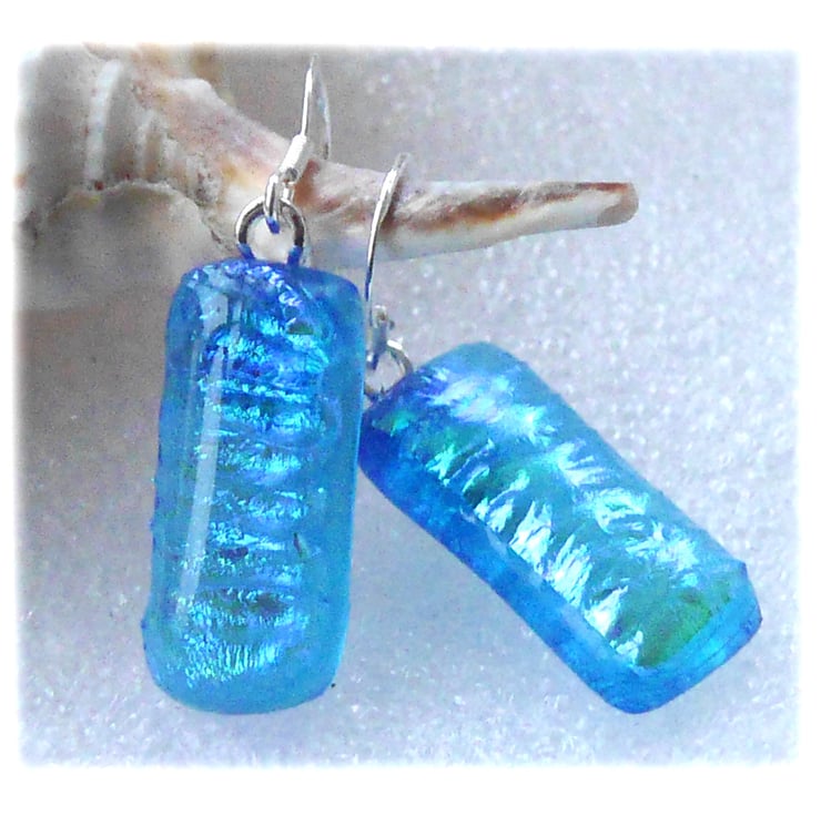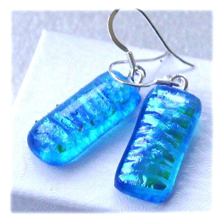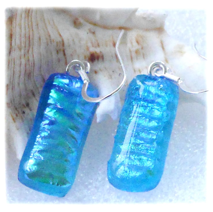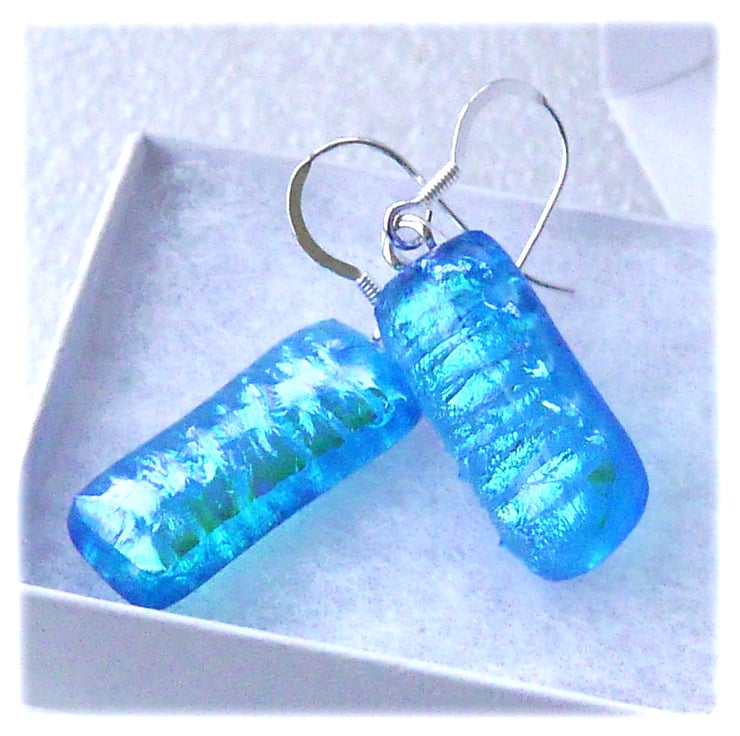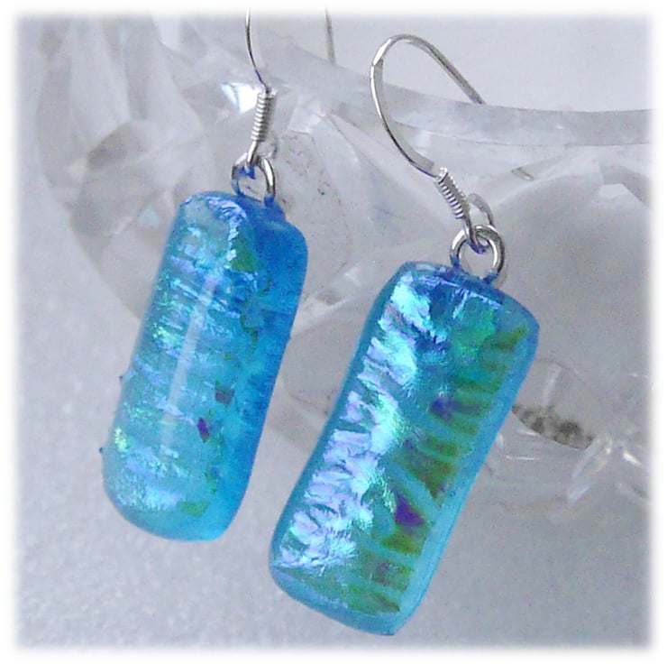 I've taken several photos of the earrings to try to show you the colour which changes in the light. this is a feature of wonderful dichroic glass. The last picture shows another 8 pairs made in the same batch and also available as separate listings.