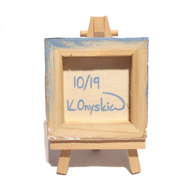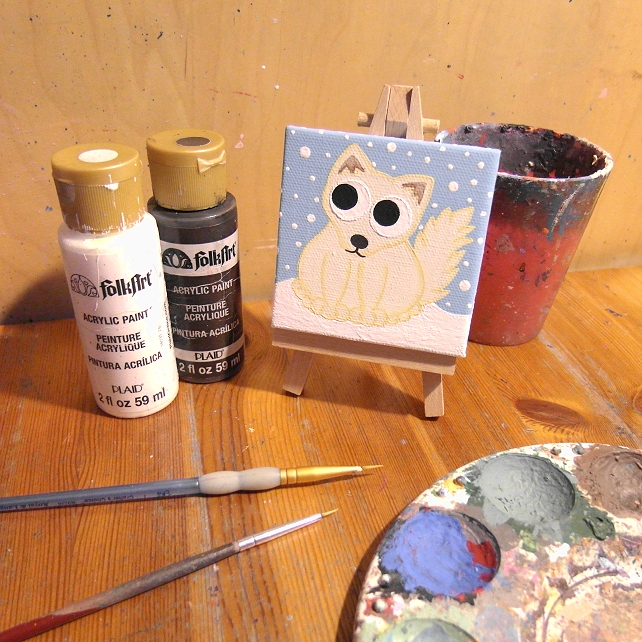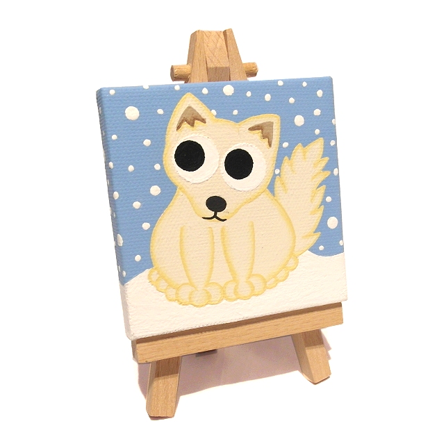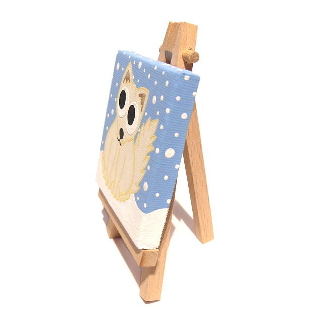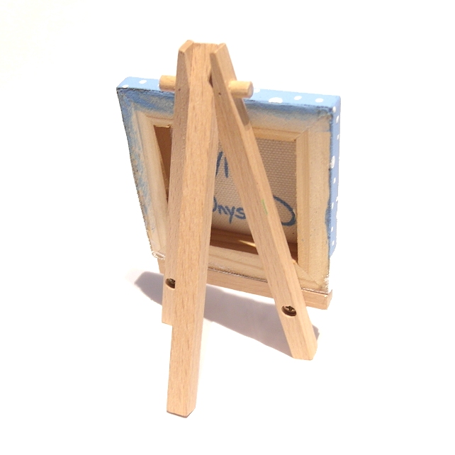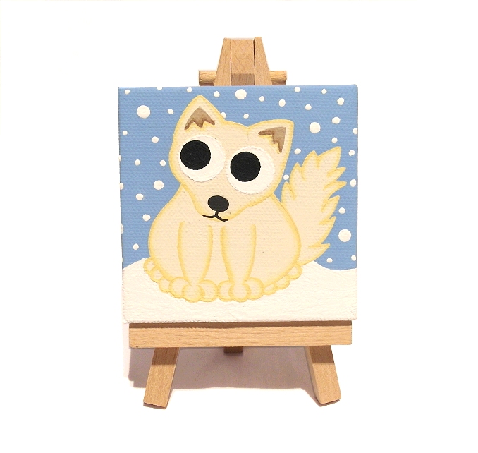 The mini fox canvas will either come with a 12cm (4.7") wooden easel for display, or will be strung with a ribbon in a colour that matches the painting so it can be hung on a wall (as in picture 9). Just choose with easel or ribbon hanging when you buy.