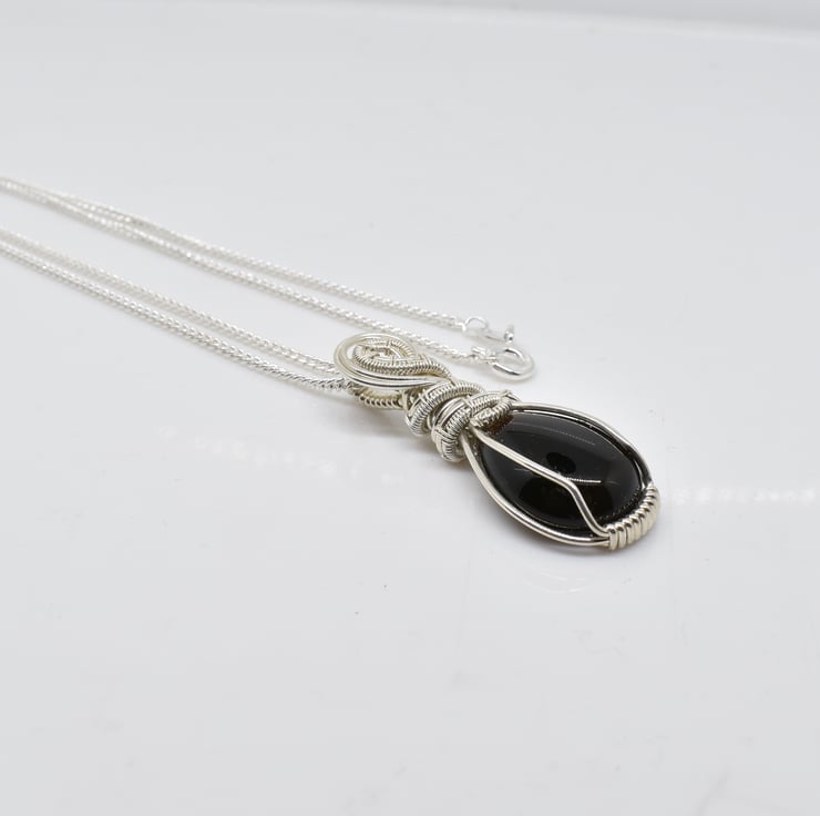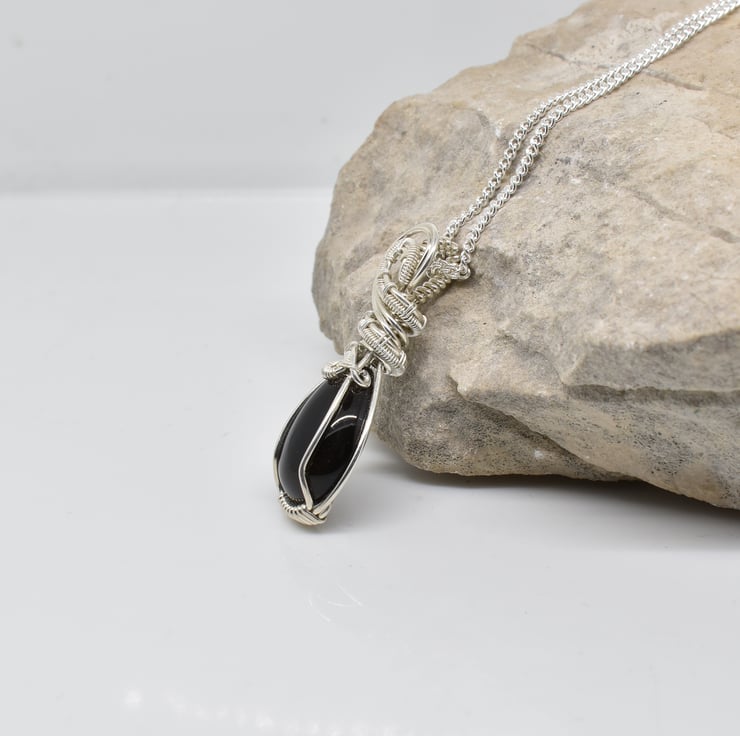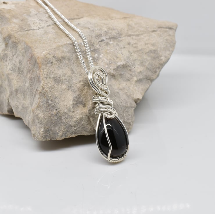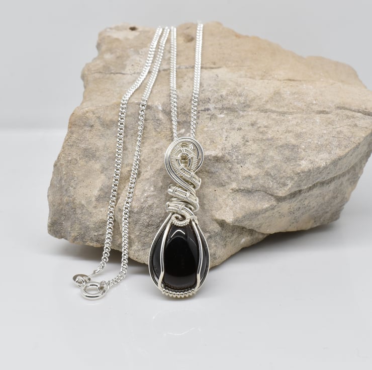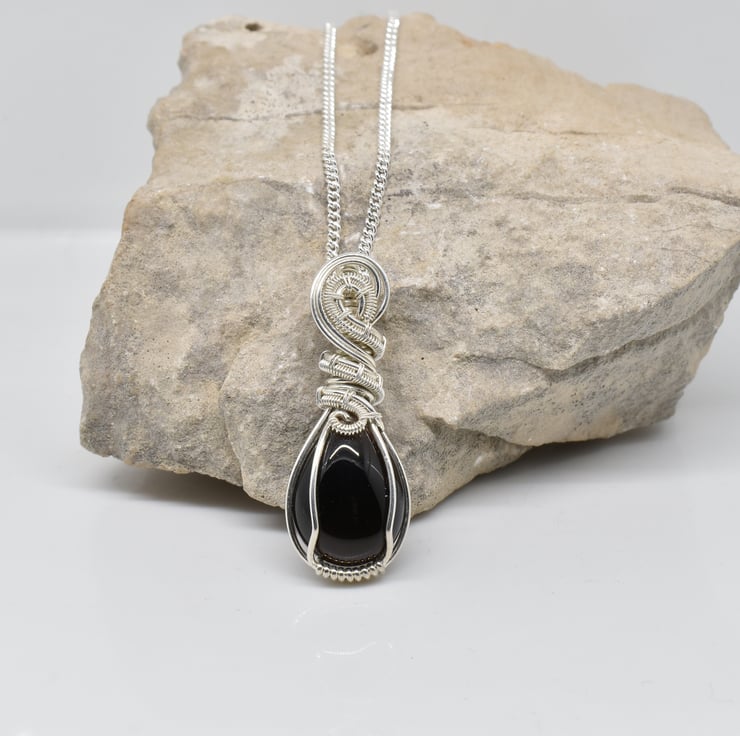A black agate I have wire wrapped and hand woven using sterling and fine silver wire to make this unisex pendant which hangs from an 18" sterling silver chain.