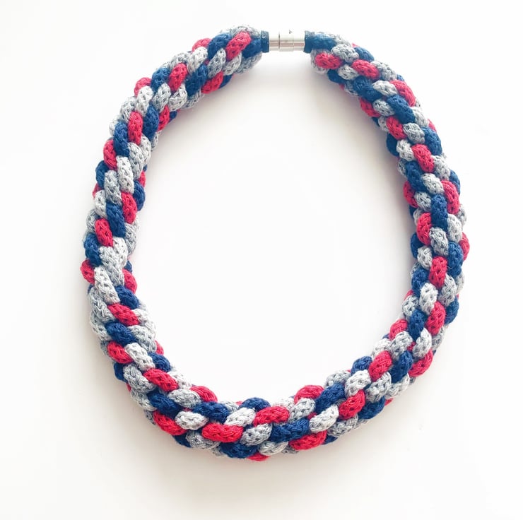 A beautiful handmade necklace. It is made using soft cotton rope. Its around 60cm in length. Can be made longer. It has magnetic lockable clasps to give a beautiful finish. This necklace is also hand washable.