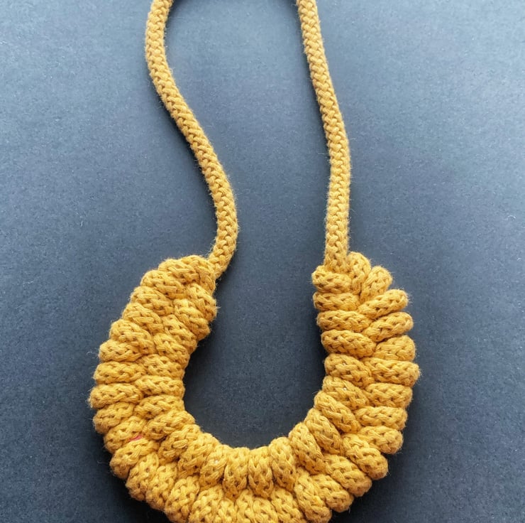 Pretty cotton necklace in mustard displayed here. It is a little twist on my Maya necklace.