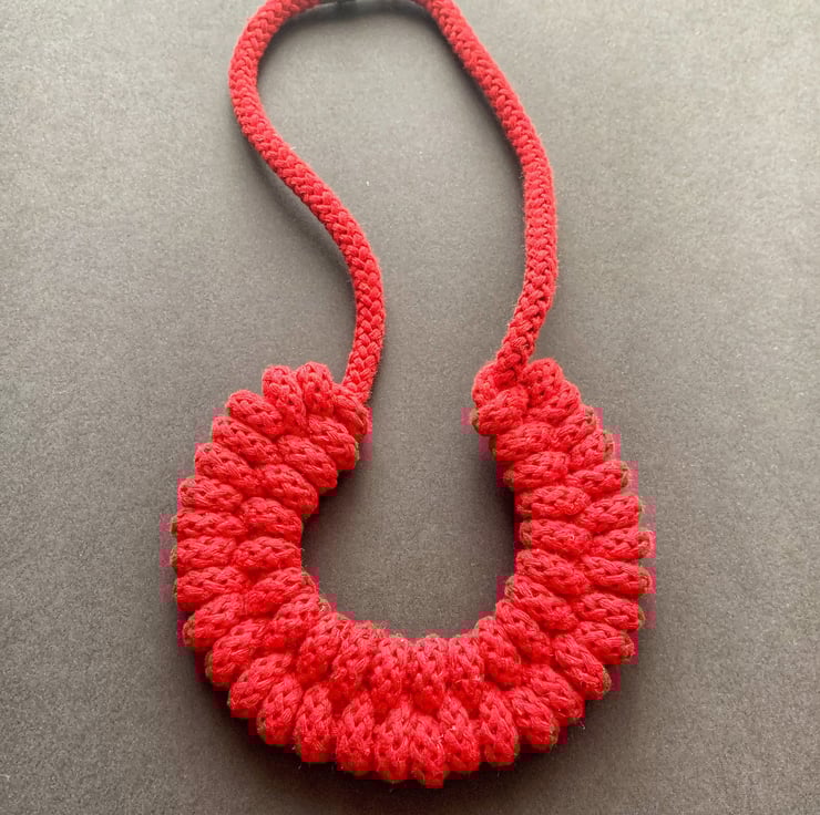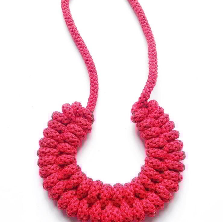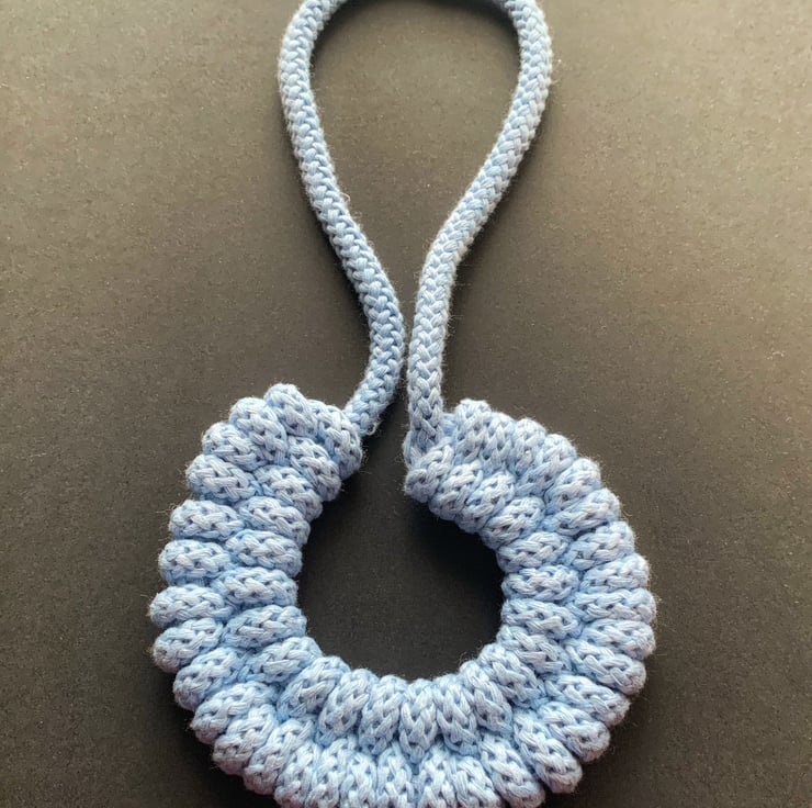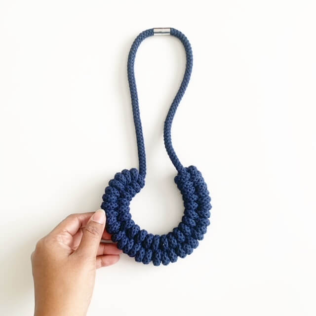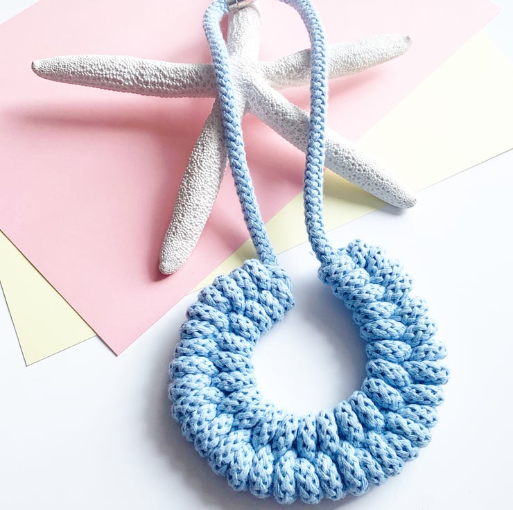 A beautiful handmade necklace. It is made using soft cotton rope. Its around 65 - 70 cm in length. Can be made longer or shorter. This necklace is also hand washable. It has magnetic lockable clasps to give a beautiful finish.