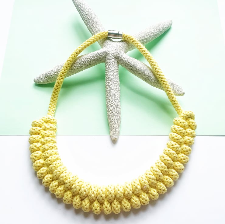 A combination of statement and minimalist styles. Instantly dress up any outfit by adding this striking piece of statement jewelry. Easy to wear and combine with any casual or elegant outfit. Comfortable necklace made from ecological and soft cotton. It is made from 100% cotton yarn and does not contain any harmful substances that pose a risk to the environment or human health.