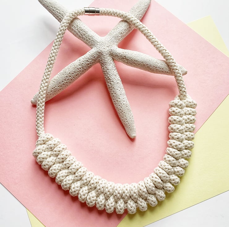 A combination of statement and minimalist styles. Instantly dress up any outfit by adding this striking piece of statement jewelry. Easy to wear and combine with any casual or elegant outfit. Comfortable necklace made from ecological and soft cotton. It is made from 100% cotton yarn and does not contain any harmful substances that pose a risk to the environment or human health.