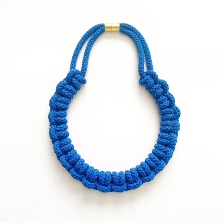 A beautiful handmade necklace. It is made using soft cotton rope. It's around 60cm in length. Can be made longer. It has magnetic lockable clasps to give a beautiful finish. This necklace is also hand washable.