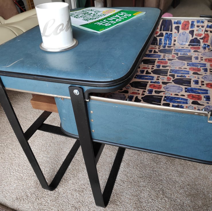 This suitcase table is handmade from a blue vintage suitcase with a specially constructed steel frame in black. The suitcase has been modified to create a sliding drawer on smooth runners to allow for extra storage space without the need to clear the table top.