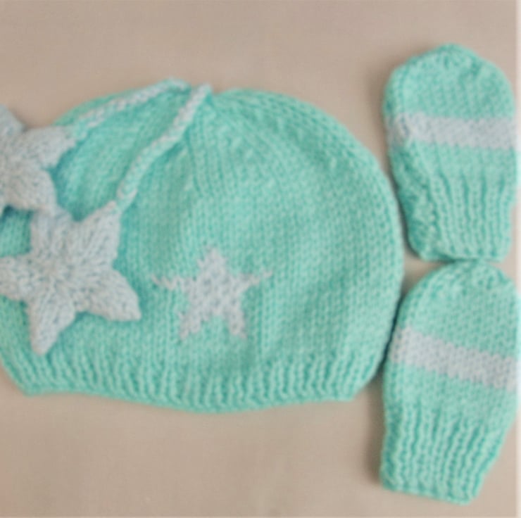 Baby's 2 piece Hat Set with Star Decoration, Prem Sizes Available, Custom Make, Baby Hat and Mittens Set, Baby Accessories, Knitted Hat, Knitted Mittens, Baby Shower Gift, New Baby Gift
