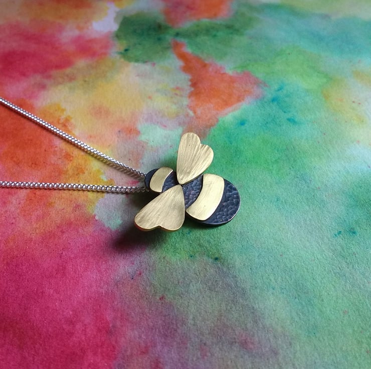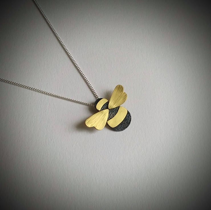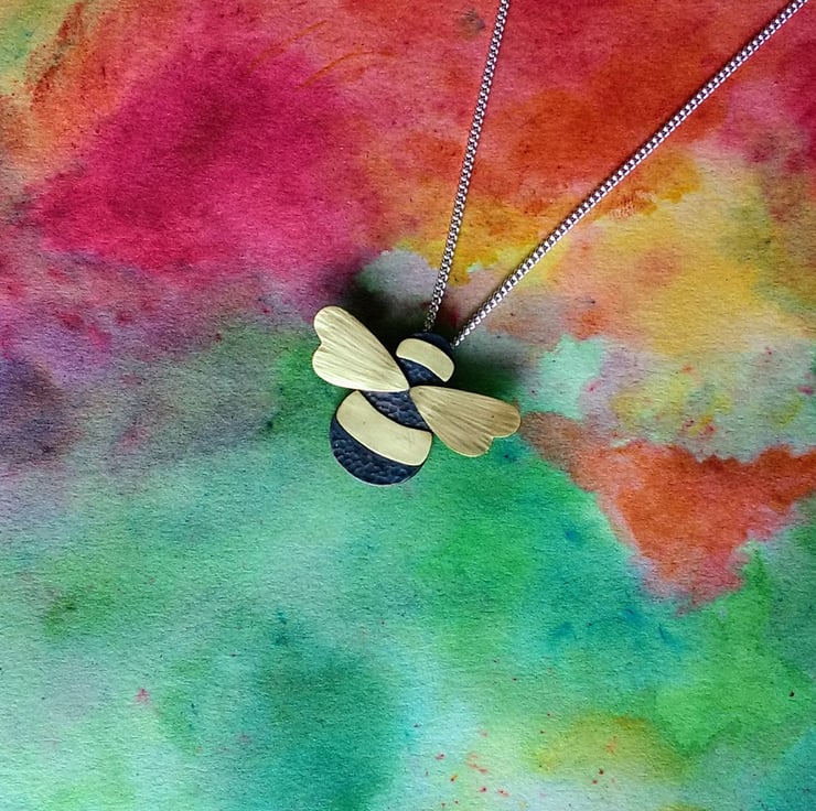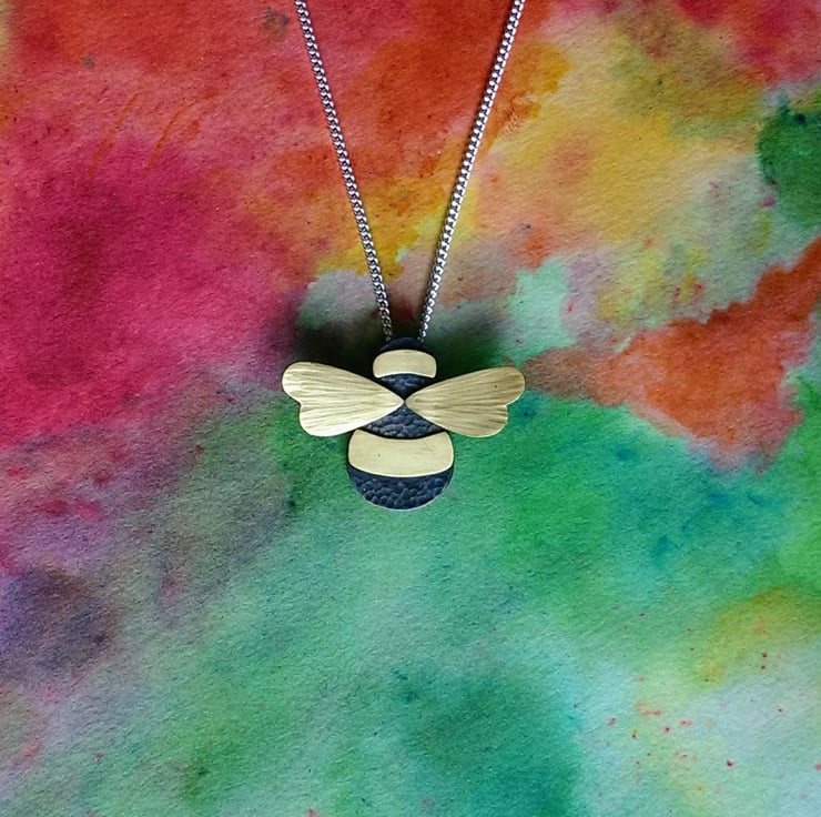 Handmade in our Yorkshire studio, this beautiful Bumble Bee Necklace/Pendant has an oxidized dimpled textured Copper body, with smooth Brass stripes and textured Brass wings. It has a concealed tube at the back which the Sterling Silver Curb Chain is threaded through (Please select your desired chain length at checkout). The Bee is created completely by hand and the textures are hand hammered so each Bee is unique.