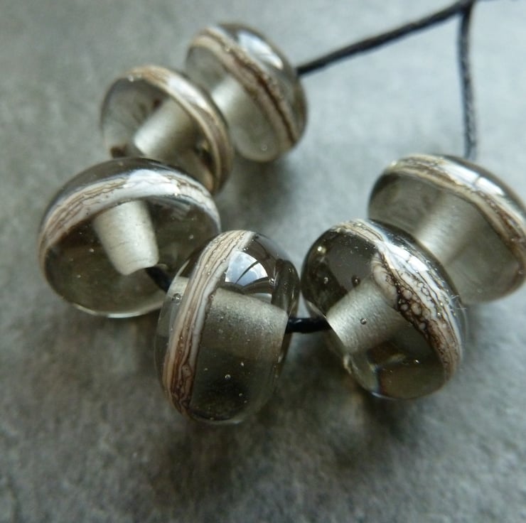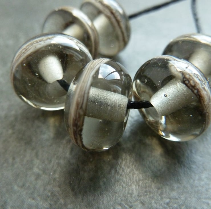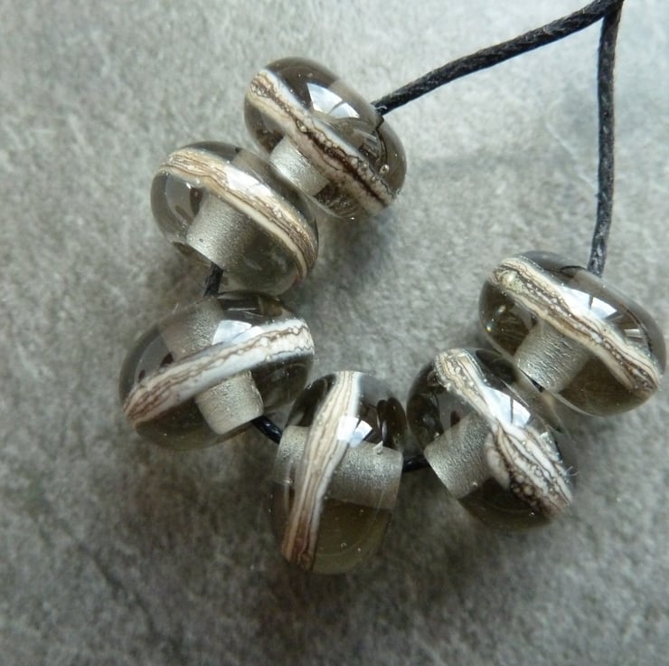A set of 6 lampwork glass beads made with grey glass and wrapped with silvered ivory.