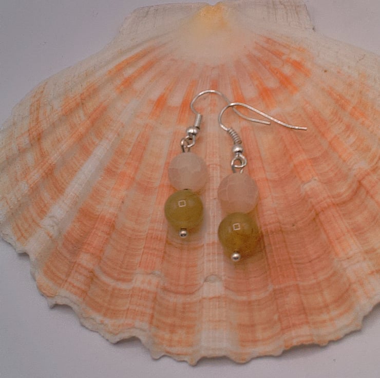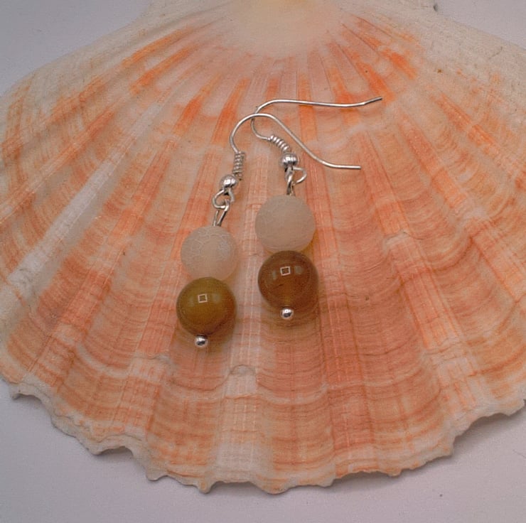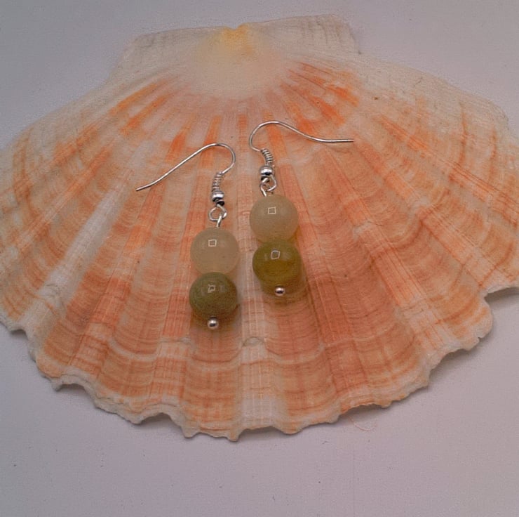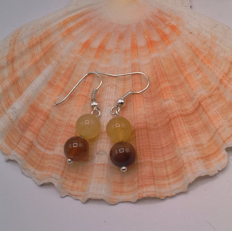 These lovely earrings will put the finishing touches to any outfit you wear everyday or for an evening out. They would make the perfect gift for a friend or relative for a birthday, anniversary or Mother's Day, or a lovely treat for yourself. They are made using 8 mm olive green fluorite beads and an 8 mm cracked agate bead hung on silver plated ear hooks. They have a drop of 0.75 inch (2 cm).
