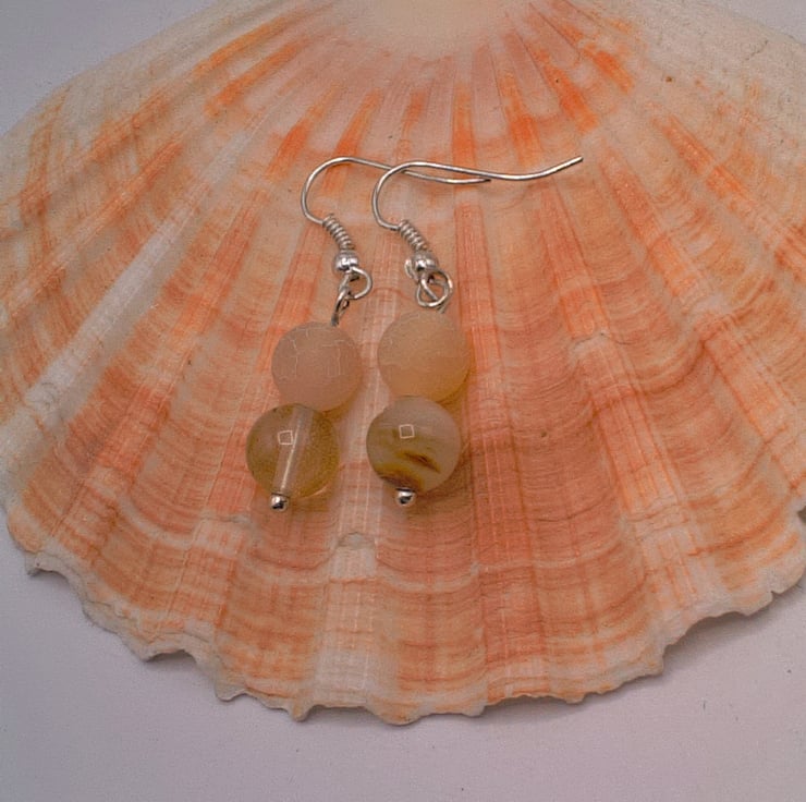- 1 pair of very pale green with brown flecks and white cracked agate beaded earrings