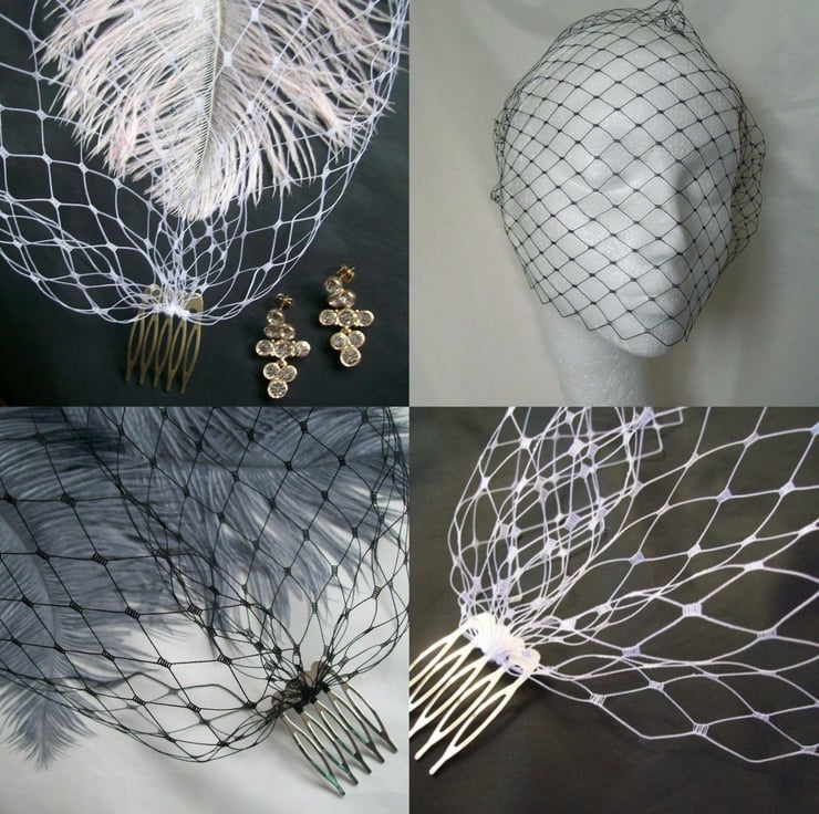 I can offer a wide range of veiling types including, classic Russian, Merry Widow, mega Merry Widow, spotted, pearl & rhinestone merry widow, vintage waffle weave, tulle and lace.
