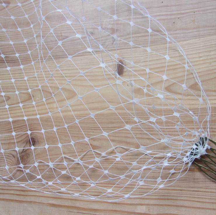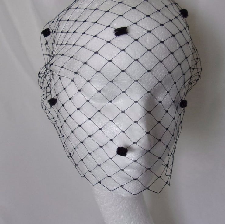 This is a bandeau birdcage style veil made from slightly stiffer & wider Merry Widow veiling, which with its larger holes gives a much more dramatic look.