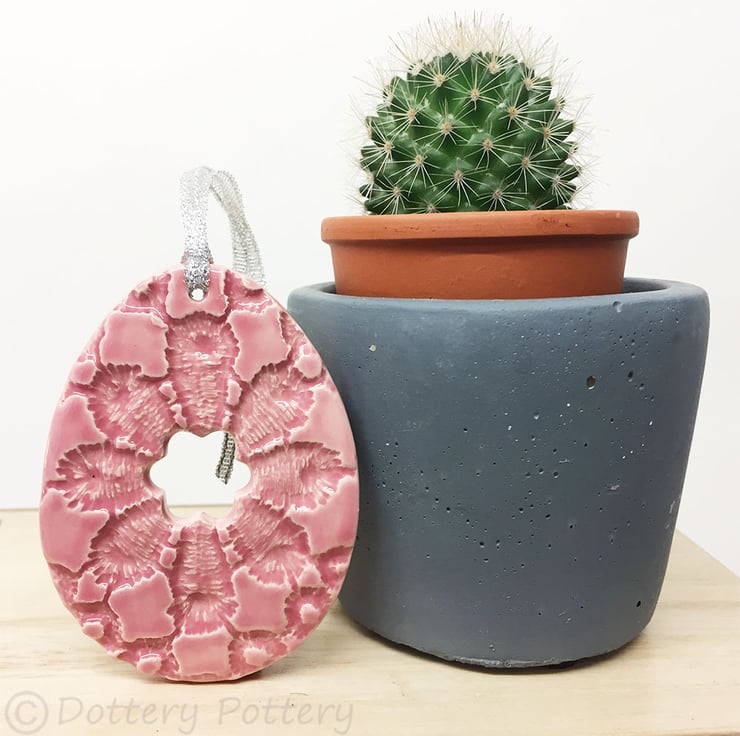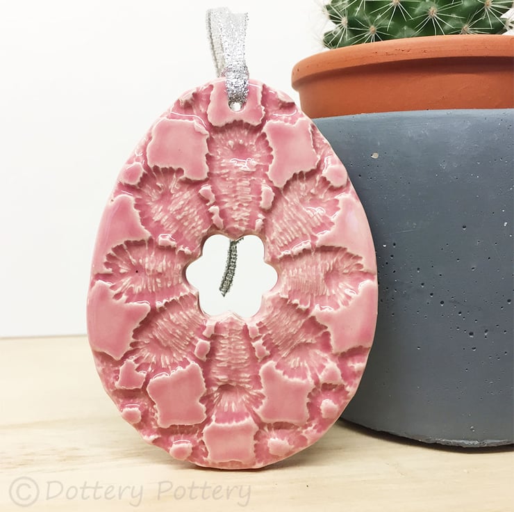 This pottery Easter Egg decoration is hand cut from white earthenware clay and omprinted with a lovely rich, textured pattern. It has then been fired once, a glossy green glaze is applied and it is then fired again - so is nice and strong. This is the price for ONE egg. It measures 7.5cm x 5.5cm and hangs from a silver string. It is glazed on the front and left plain on the back.