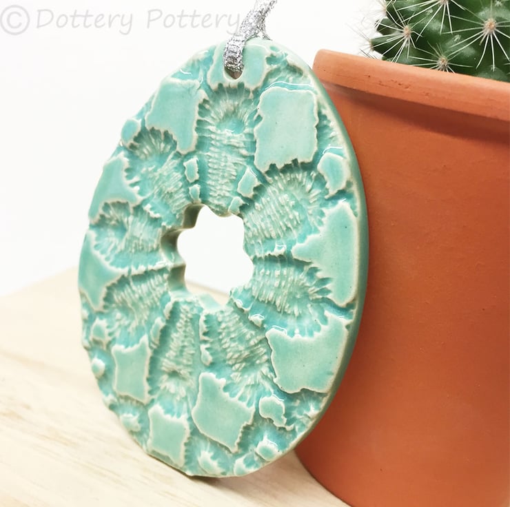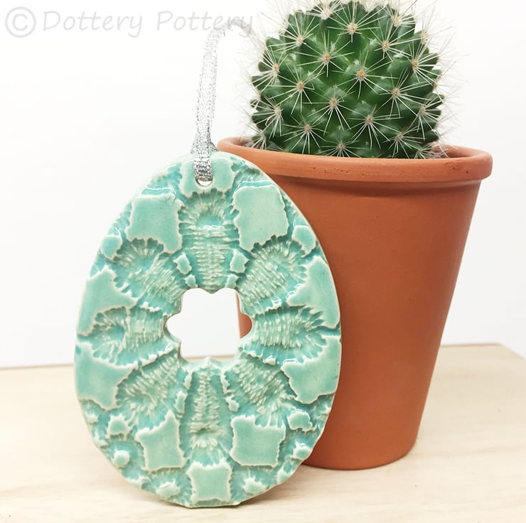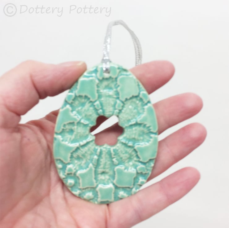 This pottery Easter Egg decoration is hand cut from white earthenware clay and omprinted with a lovely rich, textured pattern. It has then been fired once, a glossy green glaze is applied and it is then fired again - so is nice and strong. This is the price for ONE egg. It measures 7.5cm x 5.5cm and hangs from a silver string. It is glazed on the front and left plain on the back.