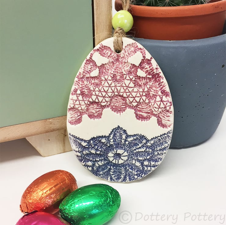 This pottery Easter Egg decoration is hand cut from white earthenware clay and imprinted with a lovely rich, textured pattern. It has then been fired once, a glossy glaze is applied and it is then fired again - so is nice and strong. This is the price for ONE egg. It measures 7.5cm x 5.5cm and hangs from a silver string. It is glazed on the front and left plain on the back.