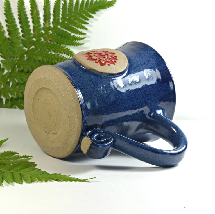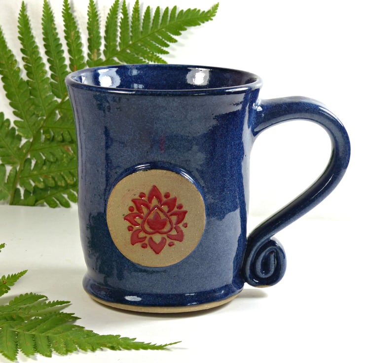 On the side of the mug there is a lovely raised circle with the an Indian stamp of the lotus flower pressed into it and highlighted in red glaze.