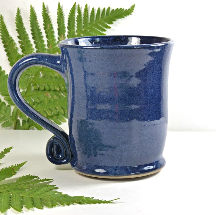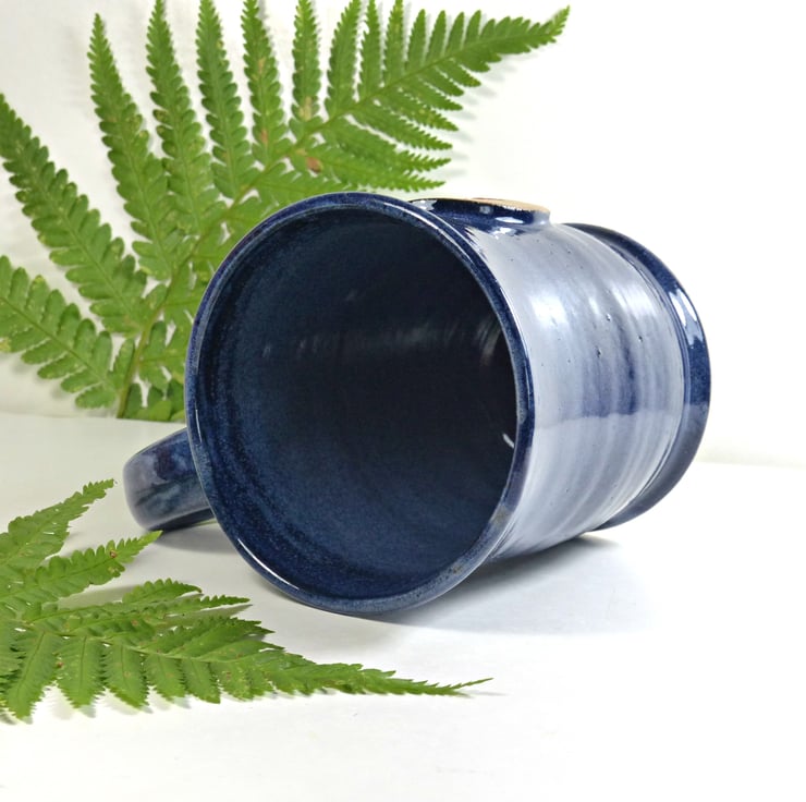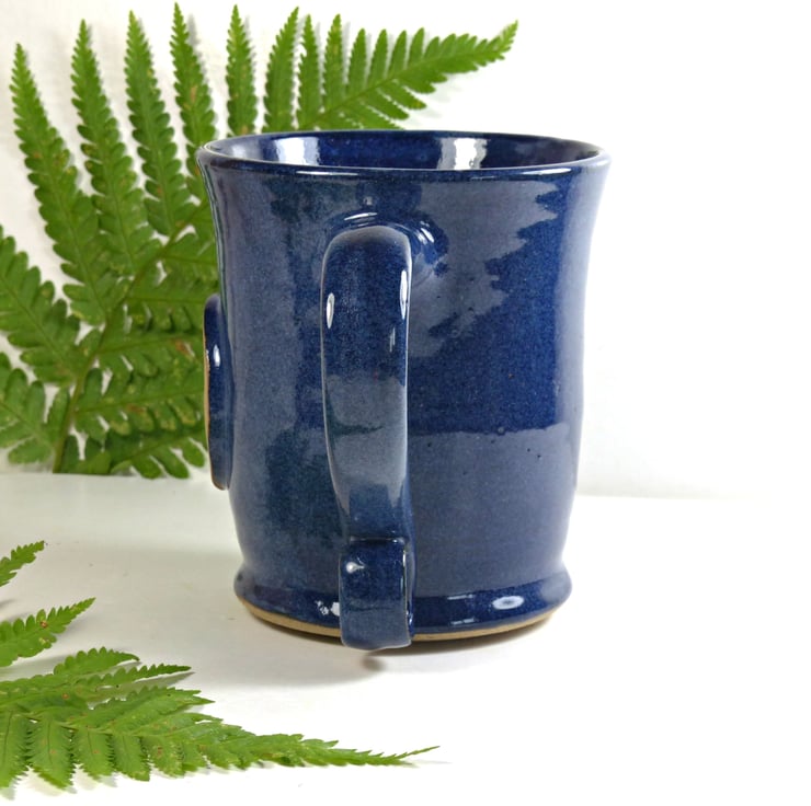 I threw this mug on the potter's wheel using a buff stoneware clay. I then turned the base and added the handle and decoration before bisque firing the mug. I glazed it using a lovely rich blue glaze and again fired it, this time to 1240C stoneware making it strong and durable.