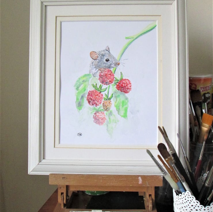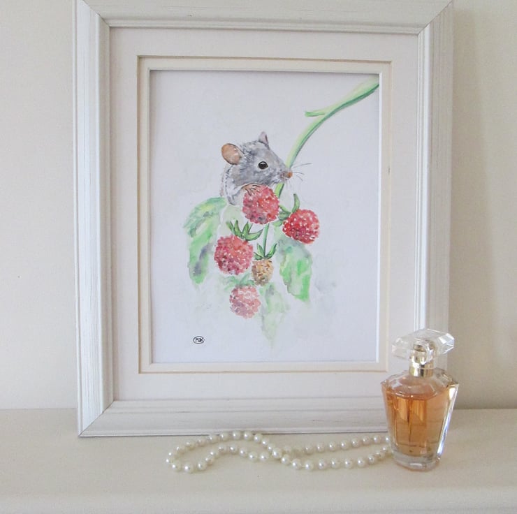 Cute Field Mouse and Raspberries art, original painting