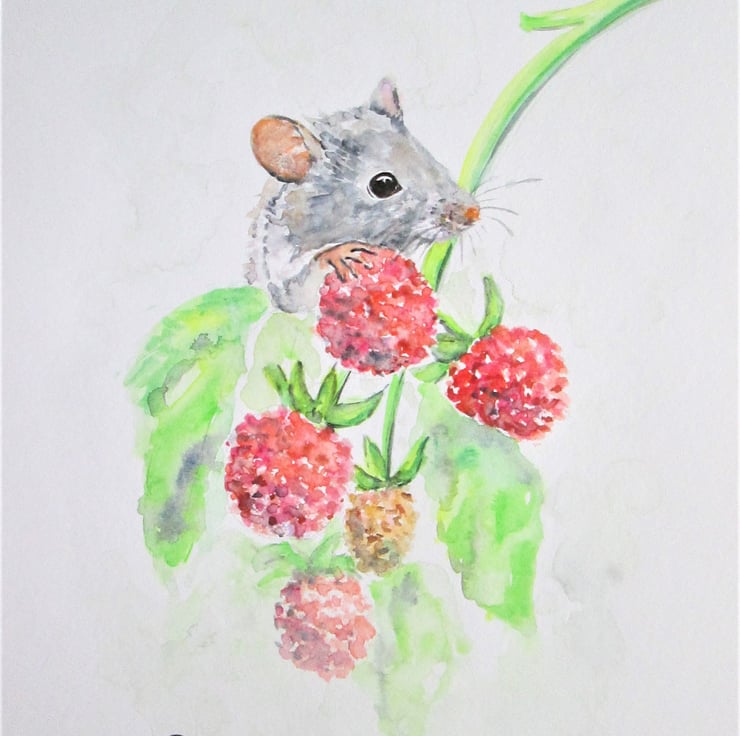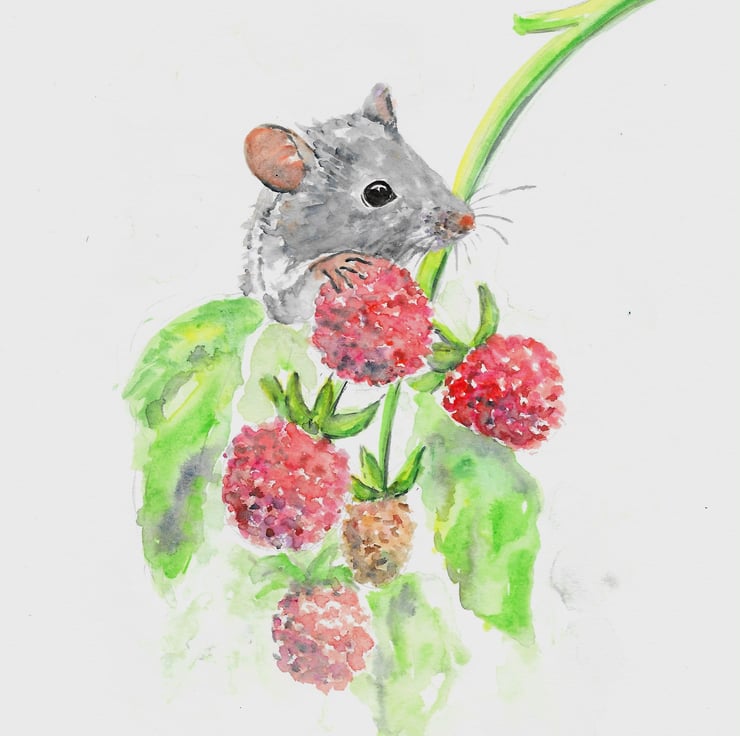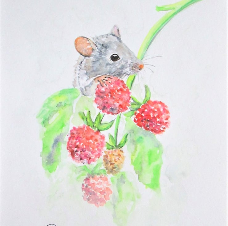 I quite like painting little rodents. This time with some raspberries. Little field mouse being a bit hungry for a juicy berry. It was a fun artwork to design and paint