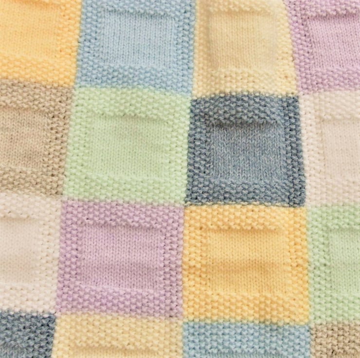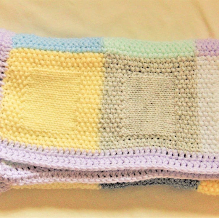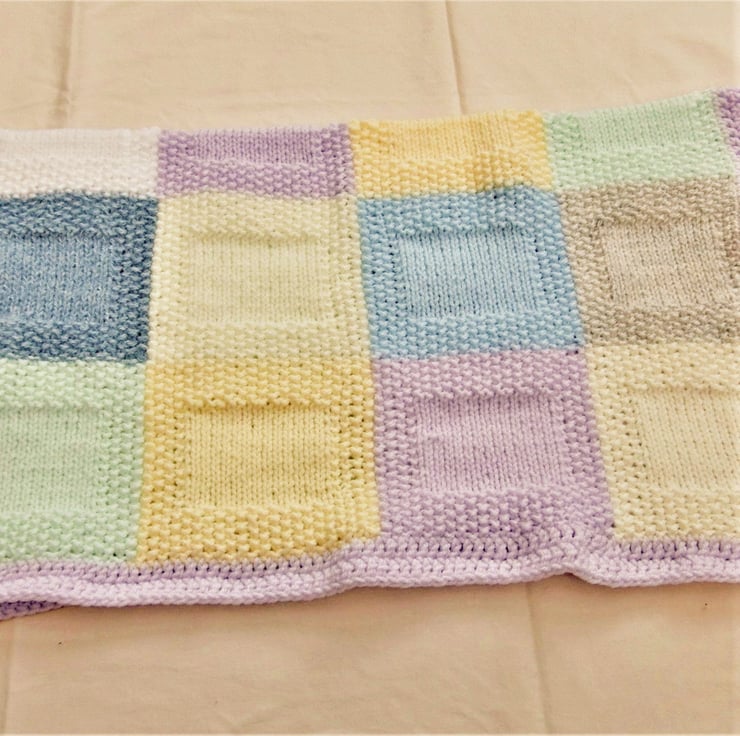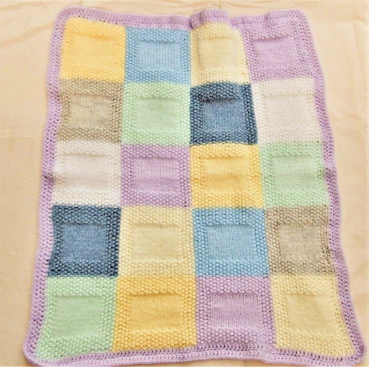 Beautiful patchwork style baby blanket. It is hand knitted in soft baby aran weight yarn which gives it a bit of extra warmth. There are 20 squares used to make up the blanket and the overall measurements of the blanket are 28" (71 cm) x 23.5" (59.75 cm).