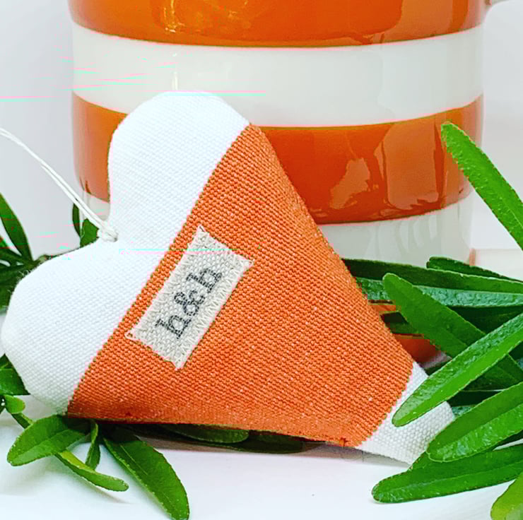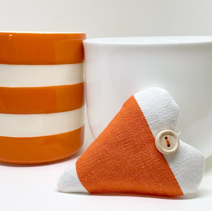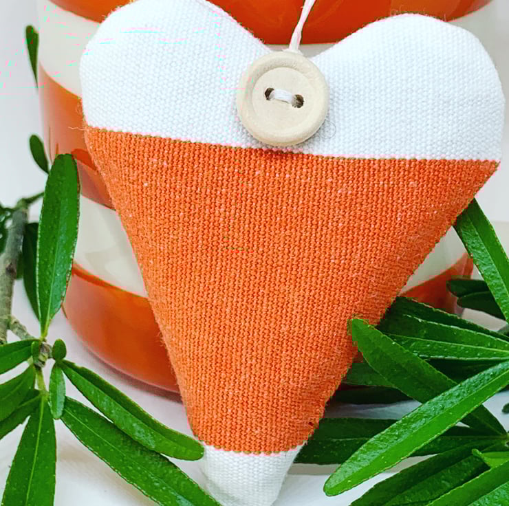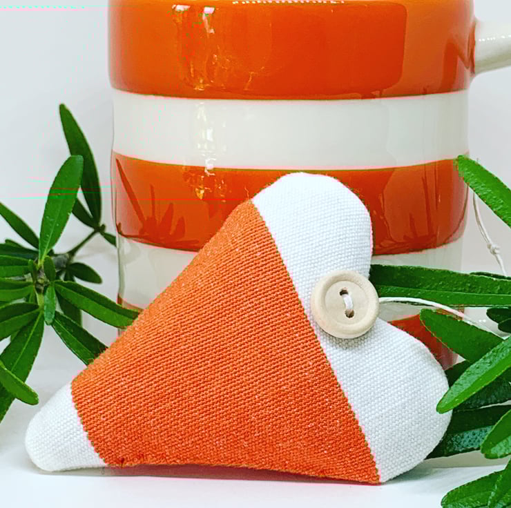 In a bright happy orange and white broad striped cotton, plumply filled with locally grown Hampshire lavender, the hearts are hand-finished with a rustic wooden button and a natural hemp twine hanging loop.