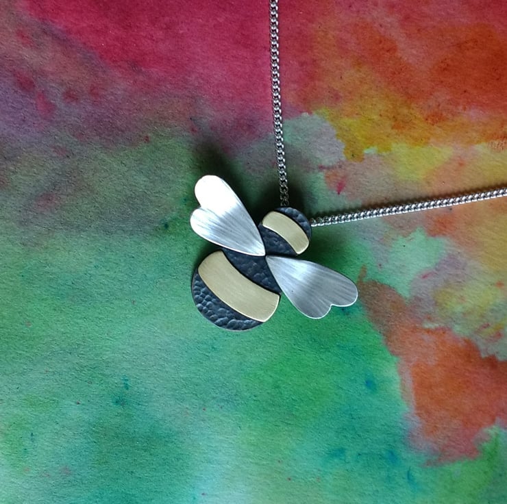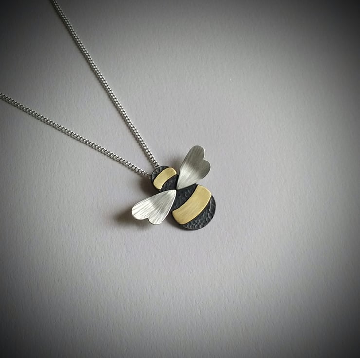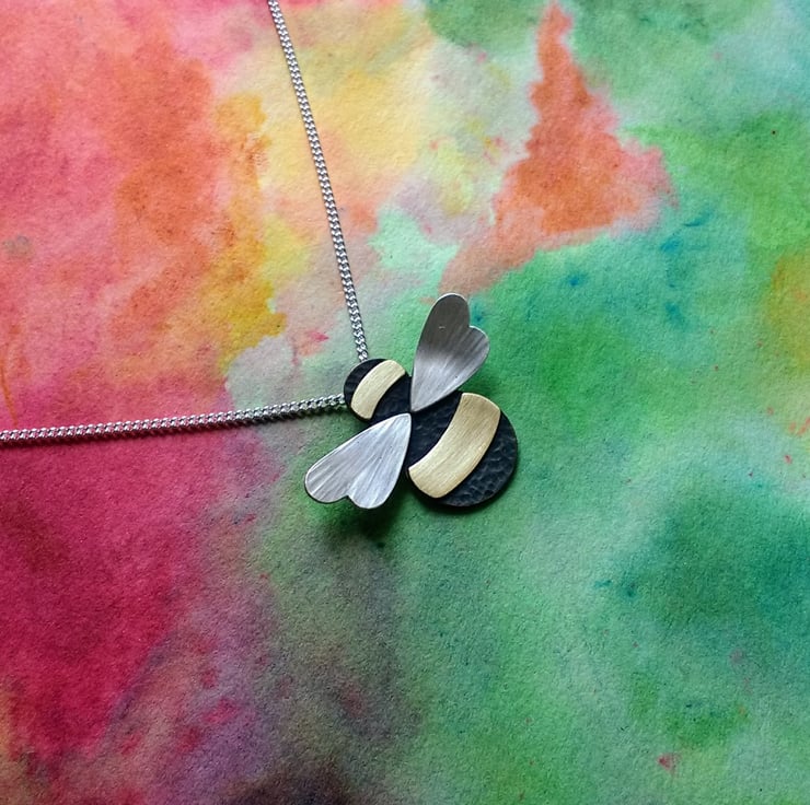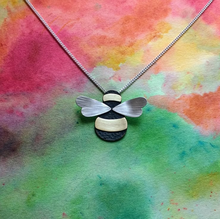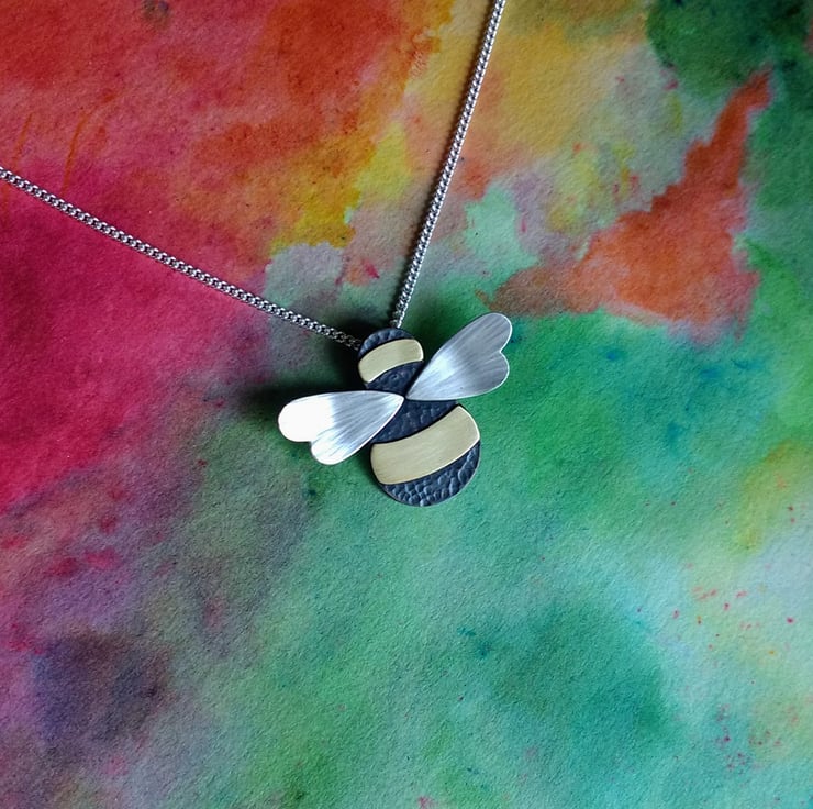 Handmade in our Yorkshire studio, this beautiful Bumble Bee Necklace/Pendant has a dimple-textured oxidized Copper body, with smooth Brass stripes and textured Sterling Silver wings. It has a concealed tube at the back which the Sterling Silver Curb Chain is threaded through (Please select your desired chain length at checkout). The Bee is created completely by hand and the textures are hand hammered so each Bee is unique.