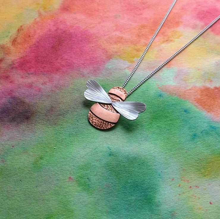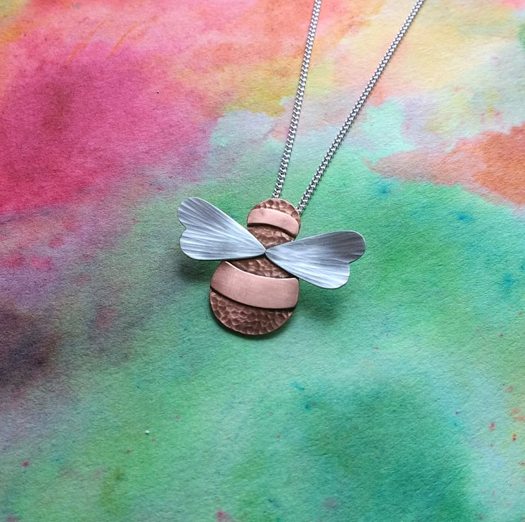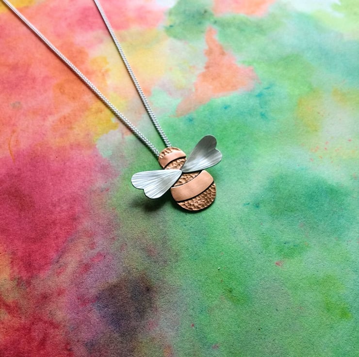 Handmade in our Yorkshire studio, this beautiful Bumble Bee Necklace/Pendant has a hand-textured dimpled Copper body, with smooth Copper stripes and textured Sterling Silver wings. It has a concealed tube at the back which the Sterling Silver Curb Chain is threaded through (Please select your desired chain length at checkout). The Bee is created completely by hand and the textures are hand hammered so each Bee is unique.