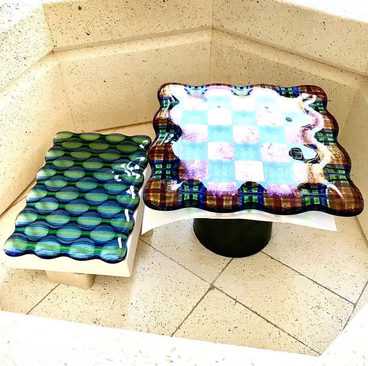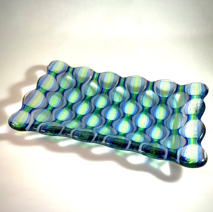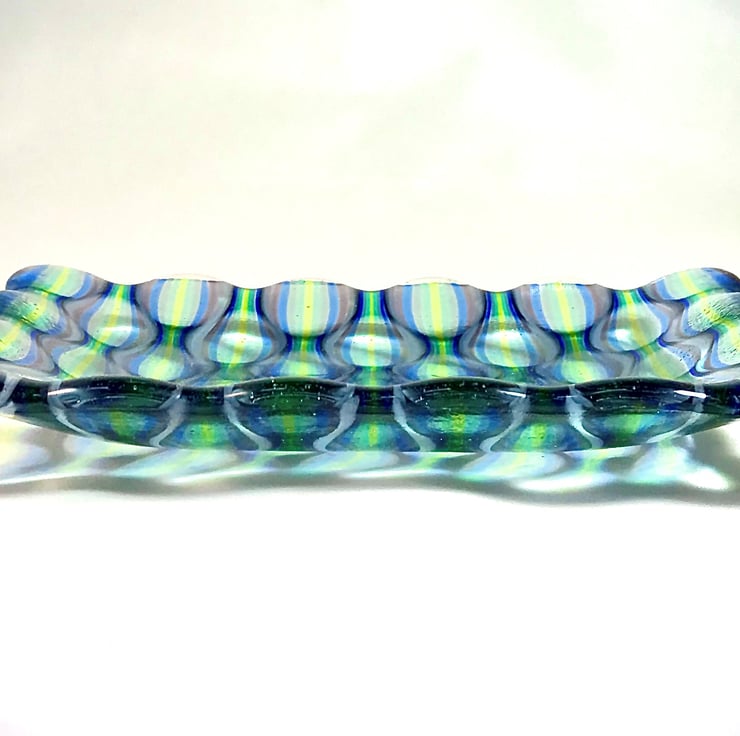 A beautiful unique fused glass dish which can be used as a soap dish, holding rings and trinkets, or sweets. It was made using multiple glass stringers arranged on a clear base of glass and fused to 800 degrees Celsius in the kiln resulting in a scalloped edge. After slowly cooling it was placed back in the kiln to slump over a dish mould to take the shape. Both firings included an annealing process to strengthen the glass and reduce and thermal shock when cooling.